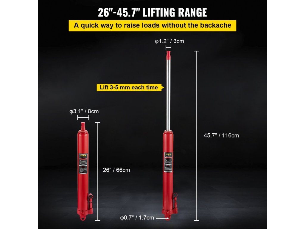 A hosszú dugattyús emelő 26" és 45,7" közötti emelési tartományt kínál, bőséges 19,7" emelési lehetőséggel. Emelje fel emelőjét könnyedén!