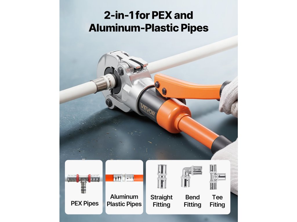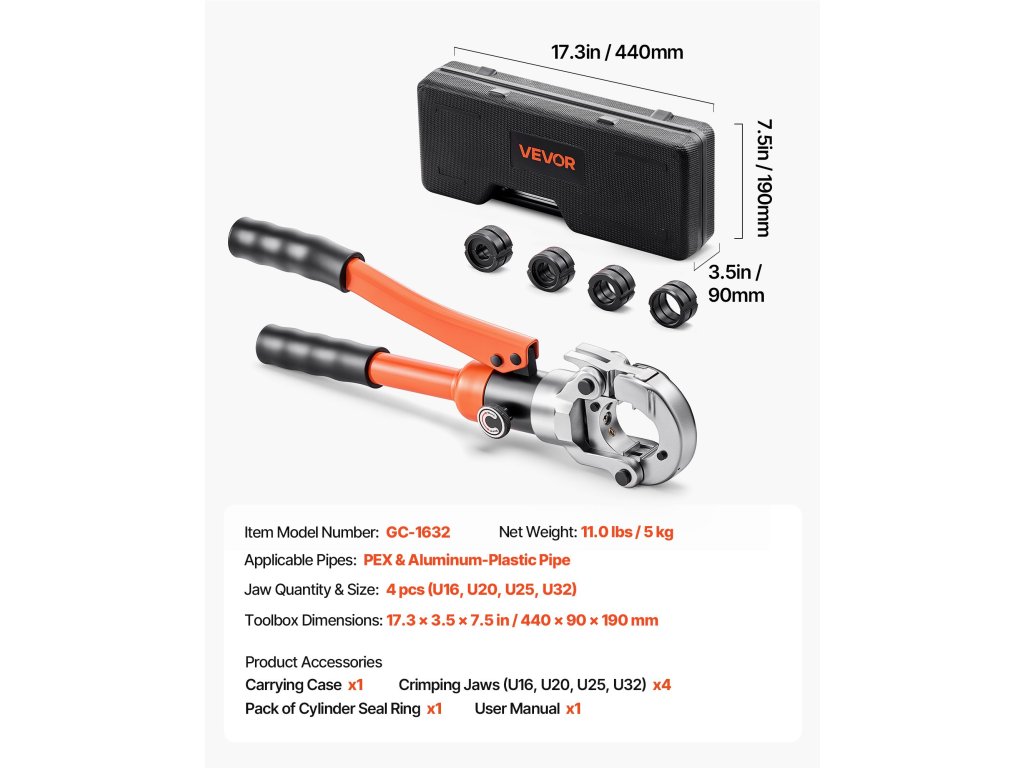 A VEVOR hidraulikus csőfűző szerszámot 4 fűzőpofával (U16, U20, U25, U32) szállítjuk PEX és alumínium-műanyag csövekhez. A fejlett hidraulikus meghajtórendszerrel működtetett eszköz gyors, szivárgásmentes krimpelést és biztonságos kötéseket biztosít a csővezetékek széles skálájához.