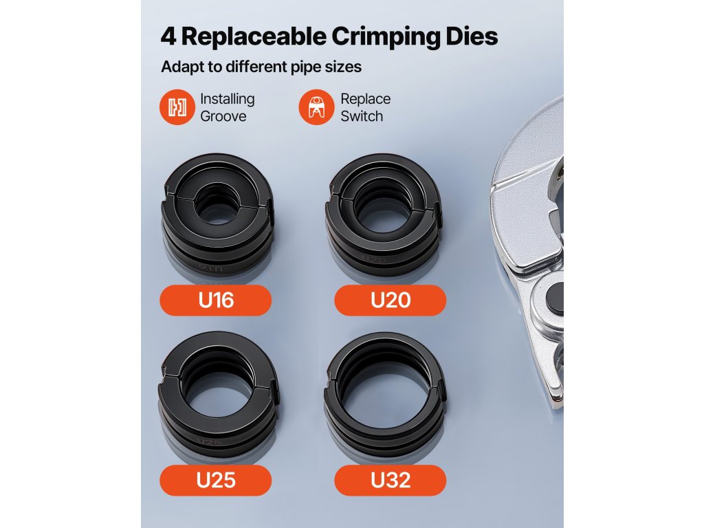 Tartalmaz 4 cserélhető pofát (U16, U20, U25, U32), amelyek rugalmasan alkalmazhatók a különböző csőméretekhez. Könnyedén gyorsabb, pontosabb és jobb minőségű préselést érhet el.