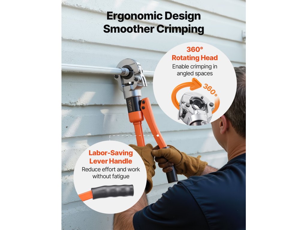 A csúszásmentes gumi markolat szilárd és kényelmes fogást biztosít, a 360°-ban forgatható fej pedig rugalmas krimpelést tesz lehetővé szűk vagy nehezen hozzáférhető helyeken, így a krimpelés könnyebbé és hatékonyabbá válik.