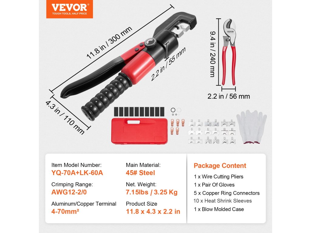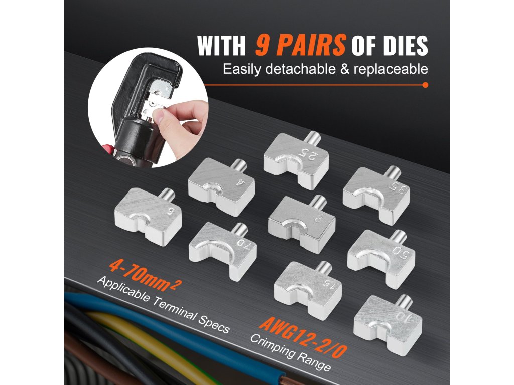 A krimpelő fogó 9 különböző anyamérettel rendelkezik, köztük 12AWG, 10AWG, 8AWG, 6AWG, 4AWG, 2AWG, 1/0AWG, 2/0AWG, 1/8".