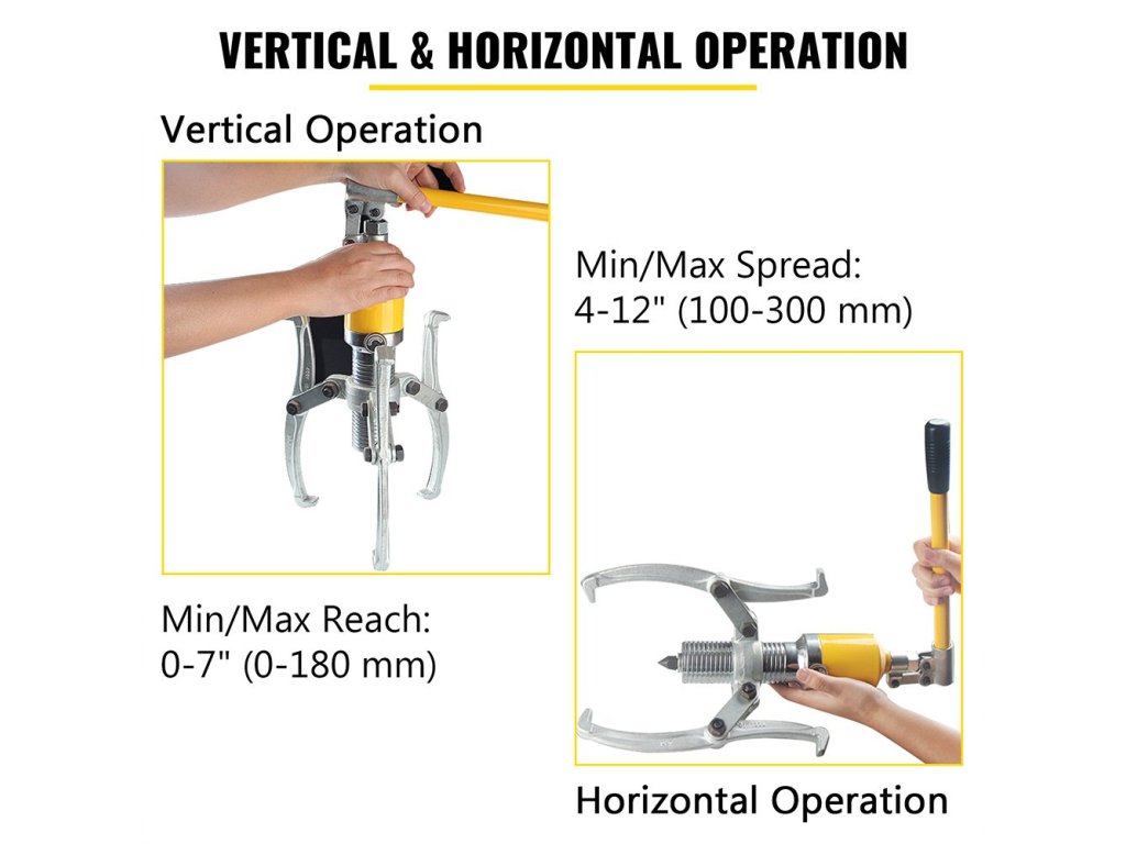 A függőleges és vízszintes működésű fogaskerékhúzó úgy van kialakítva, hogy megfeleljen a különböző követelményeknek, 0-7" (0-180mm) hatótávolsággal és 4"-12" (100-300mm) fesztávolsággal.