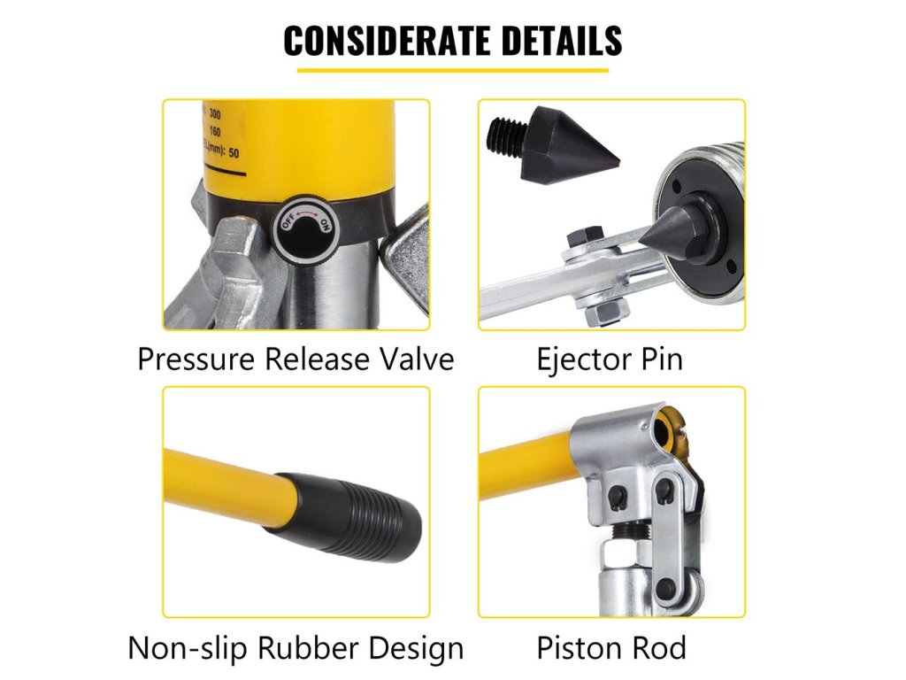 A biztonsági túlnyomásszelep megakadályozza a túlterhelést. A kidobócsap kivehető és kopásálló. A kart meghajtó dugattyúrúd simán mozog előre. A megerősített gumiköpennyel ellátott mozgatható fogantyú kényelmesen kézre áll.