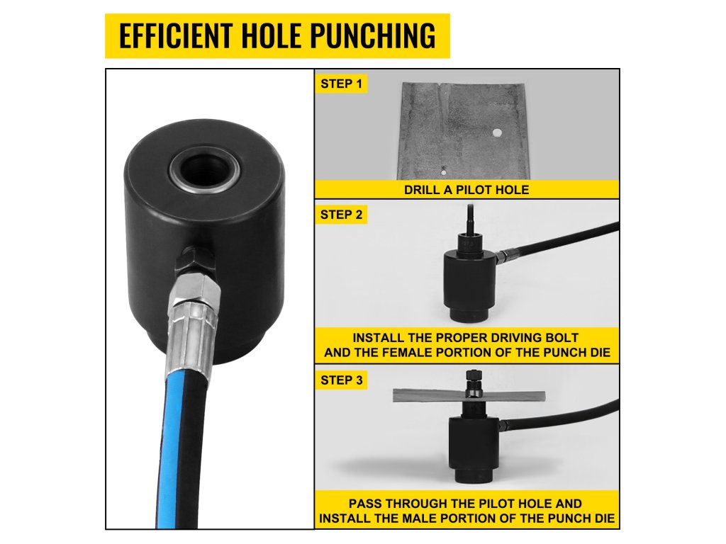 Maximális nyomás: 10T. A kiütőkészlet hidraulikus szivattyúval és 3,1"-os olajtömlővel van felszerelve, szűk helyeken is lehetséges. A hidraulikus mechanizmusnak köszönhetően a lyukak kilyukasztása gyerekjáték.