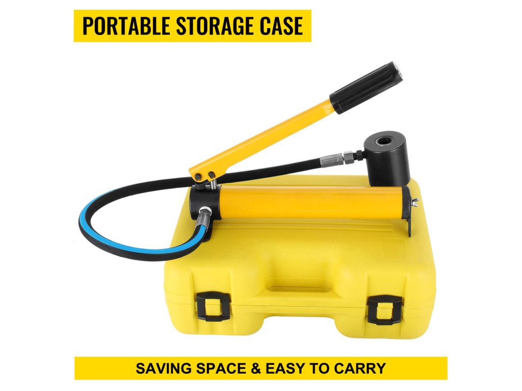 Ez a hidraulikus lyukasztó készlet kompakt és könnyen tárolható a műanyag szerszámtáskának köszönhetően. Ez helyet takarít meg, és a hidraulikus lyukasztó készletet könnyen szállíthatóvá teszi. A szerszámtáska tartós és praktikus.