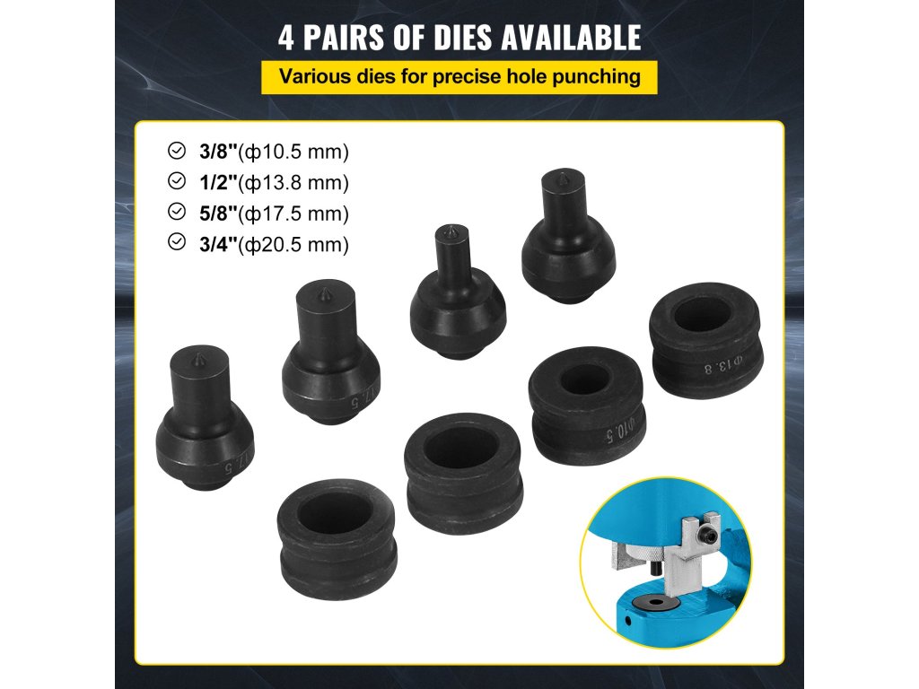Hidraulikus lyukasztó szerszámunk 3/8" (f10.5mm), 1/2" (f13.8mm), 5/8" (f17.5mm), 3/4" (f20.5mm) lyukakat tudott lyukasztani. Ezek a lyukasztók magas széntartalmú volfrámacélból készülnek, és nem könnyű elhasználódni.