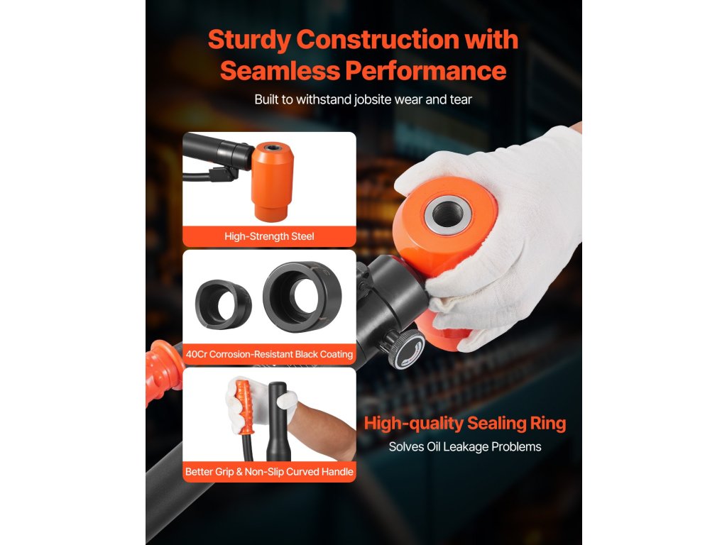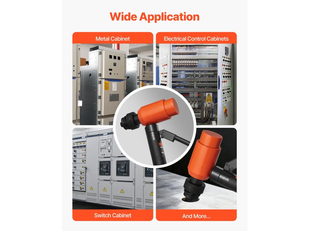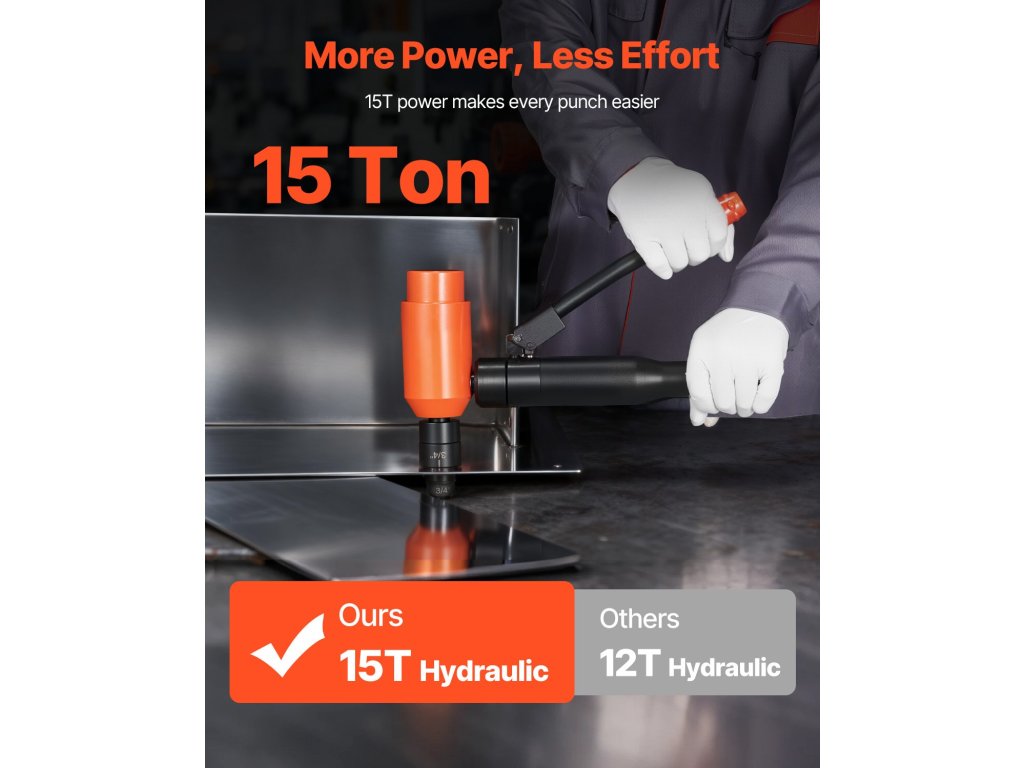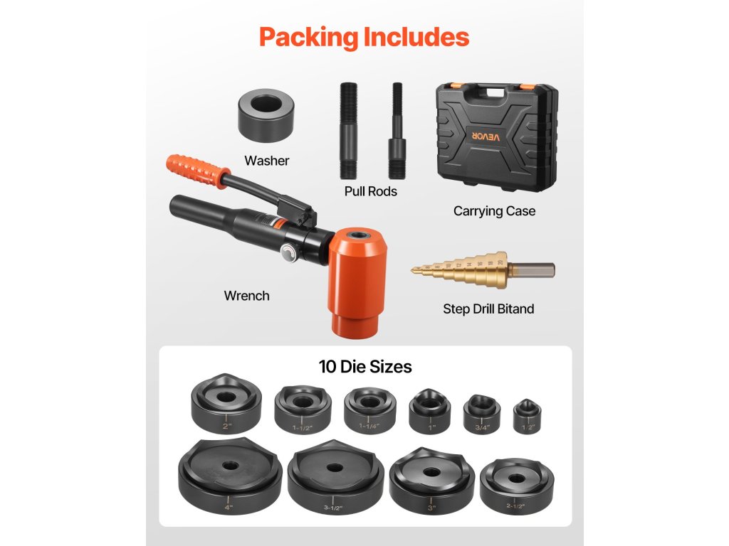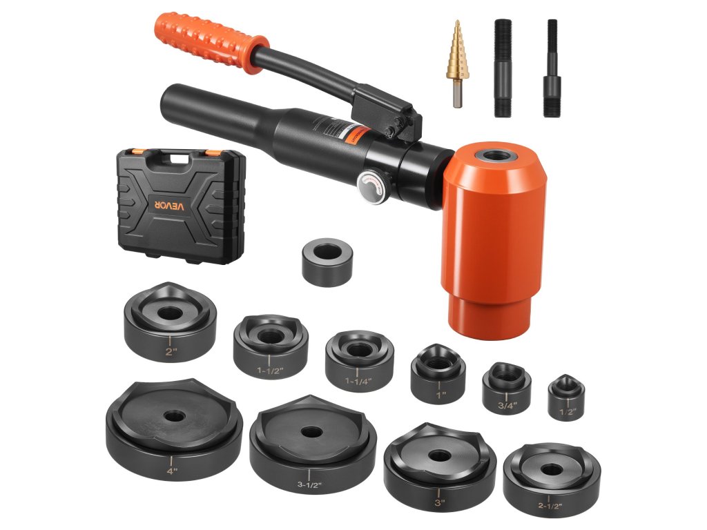 Ez a 15 tonnás/147,1 kN-os lyukasztó készlet 10 lyukasztóval (1/2" - 4"/12,7 - 101,6 mm) a lyukméretek széles skáláját lefedi. A lézeres skálamarkerek gyors és pontos pozícionálást tesznek lehetővé; a hüvelyk és milliméteres kettős skála könnyű leolvasást tesz lehetővé. Az alacsony profilú lyukasztók és a hidraulikus berendezések hatékonyan elérik a szűk vagy magasan fekvő helyeket.