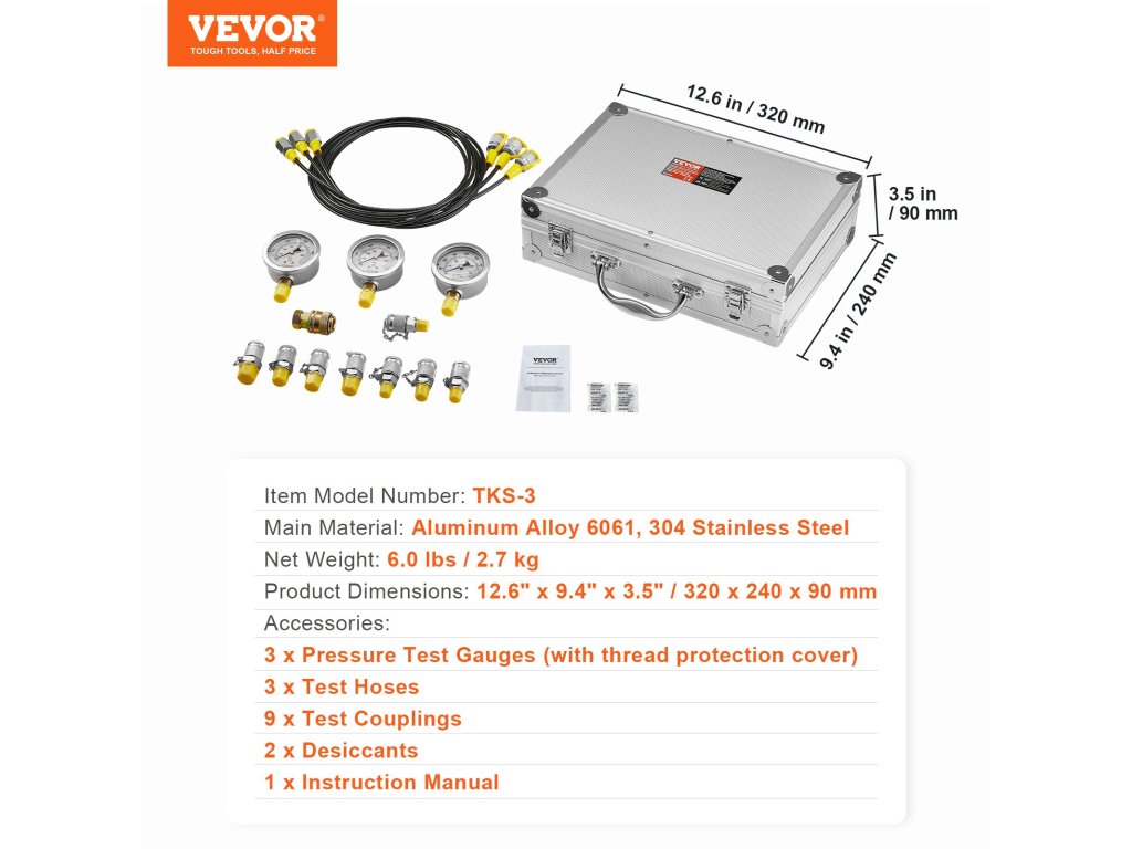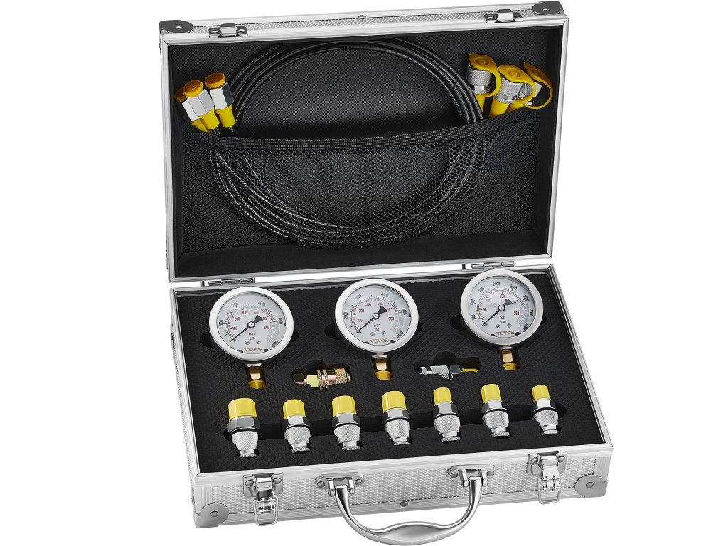 Ez a hidraulikus nyomásvizsgálati készlet 3 nyomásmérőt, 3 teszttömlőt és 9 tesztcsatlakozót tartalmaz, rendezetten egy hordtáskában. Széles mérési lehetőségek: 0-3500 PSI/250 Bar, 0-5800 PSI/400 Bar és 0-8600 PSI/600 Bar. A skálák pontos leolvasást biztosítanak psi és bar egységben is a sokoldalú használat érdekében.