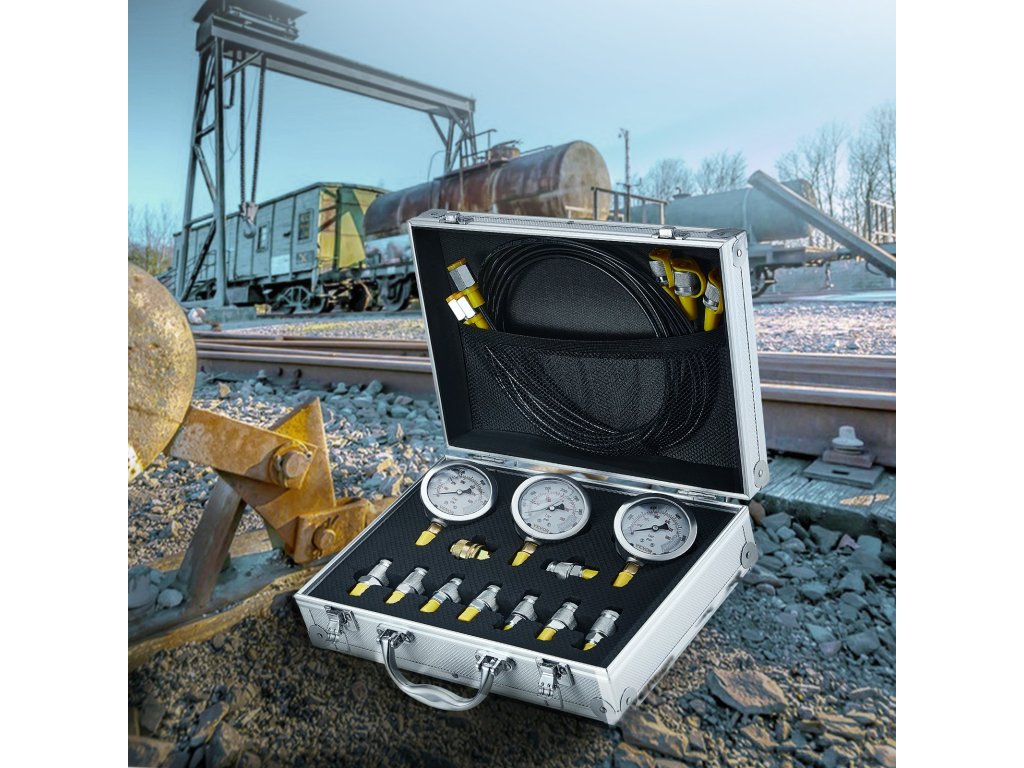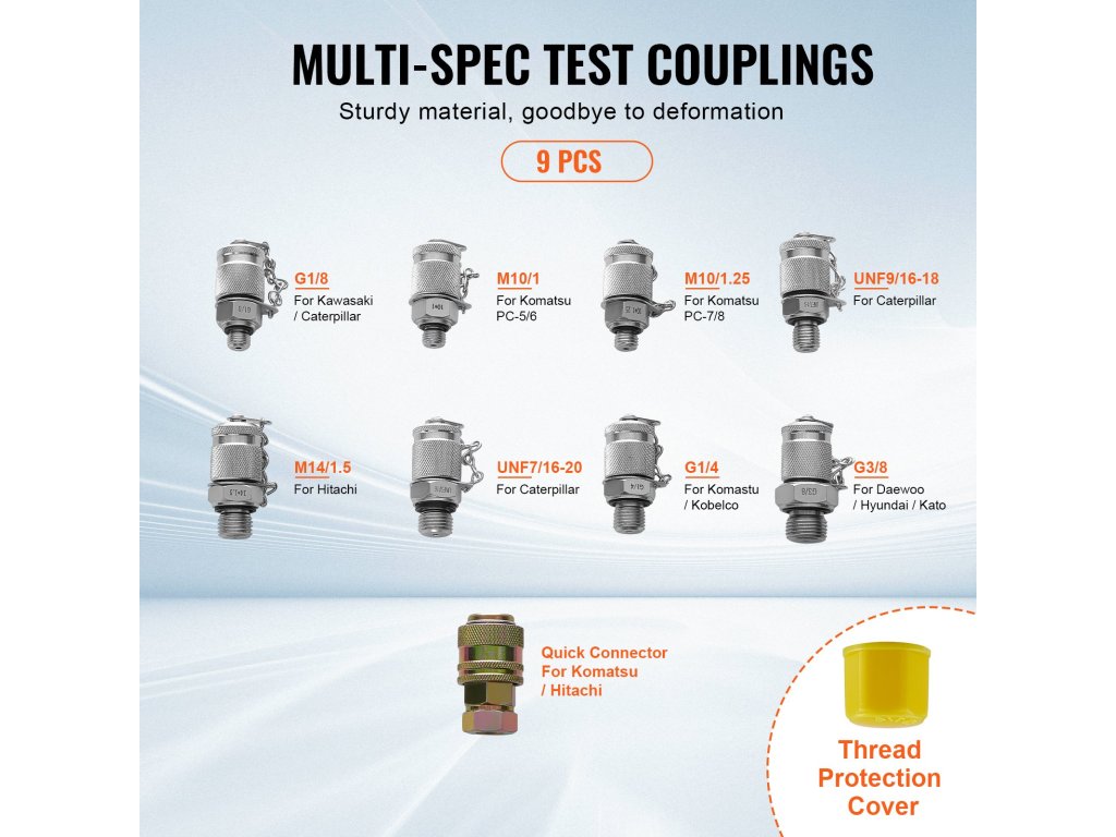 Ez a hidraulikus nyomásmérő készlet 9 különböző tesztcsatlakozóval büszkélkedhet, hogy megfeleljen a legtöbb kotrógép és hidraulikus rendszer nyomásmérési igényeinek. Ezen csatlakozók védelmét is megnöveltük a menetvédőkkel, hogy megakadályozzuk a véletlen ütések miatti deformálódást és sérülést.