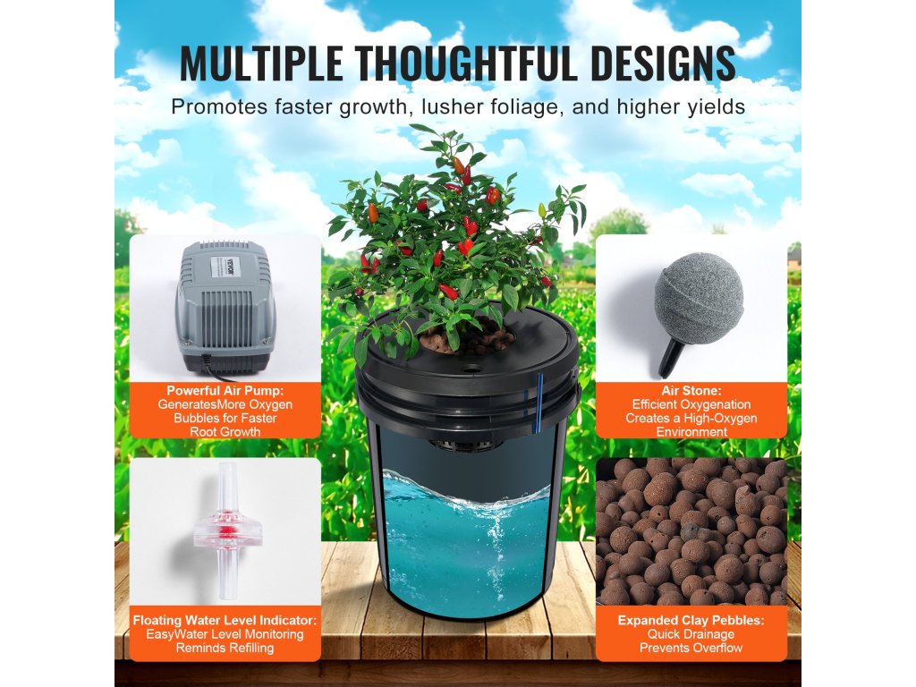 Ez a mélyvizes kultúrvödör könnyen felszerelhető a termesztő sátorban, kertben, erkélyen vagy irodában, házban. Alkalmas zöldségek, gyümölcsök, virágok és növények termesztésére. Nem korlátozzák az évszakok, és talaj nélkül is termeszthető.