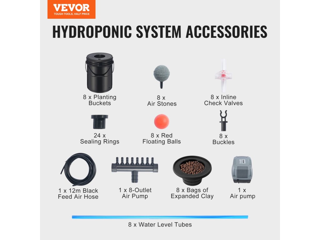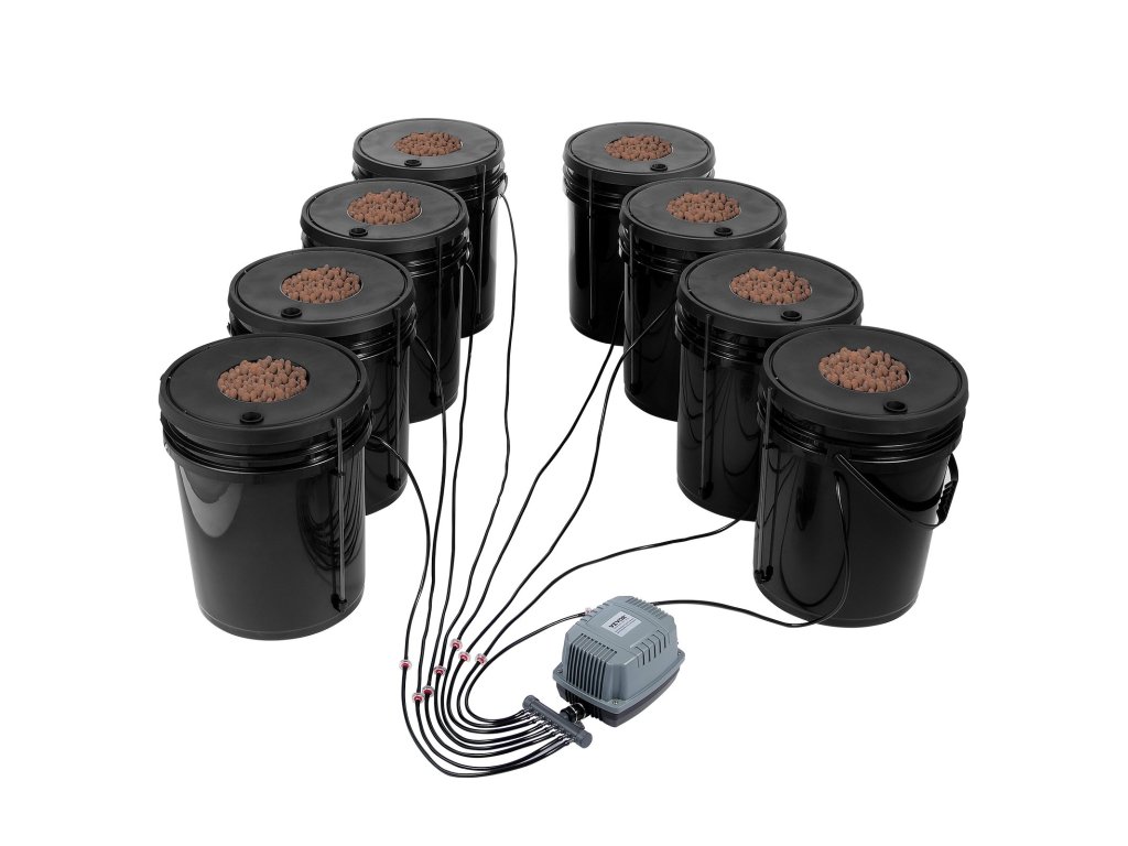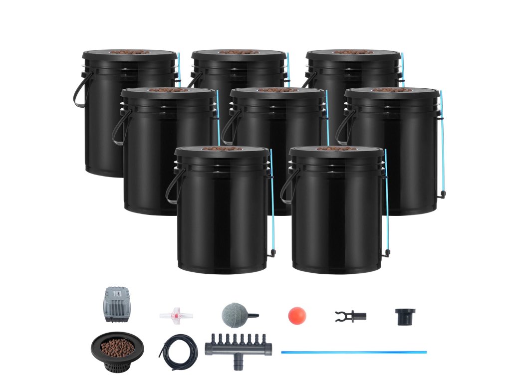 Hidroponikus DWC 8×5 gallonos vödör pumpával, kövekkel és jelzővel