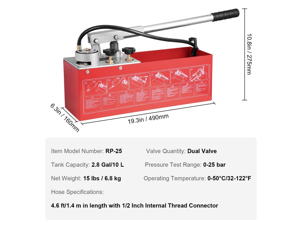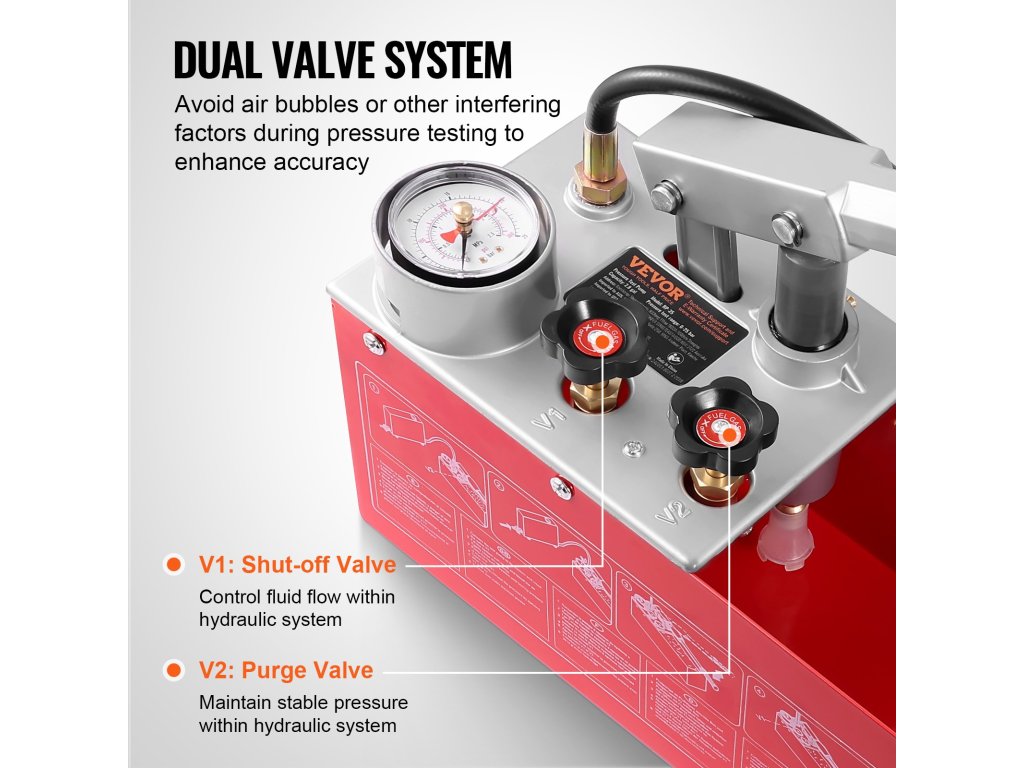 A hidrosztatikus próbaszivattyúnk robusztus fémből készült, ergonomikus fogantyúval és robusztus tömlővel. Kettős egységű nyomásmérővel, két szelepes rendszerrel és 2,8 gallonos (10 literes) víztartállyal rendelkezik, és 25 bar/2,5 MPa-ig pontos méréseket biztosít. Frissítsen a könnyed nyomásvizsgálathoz még ma!