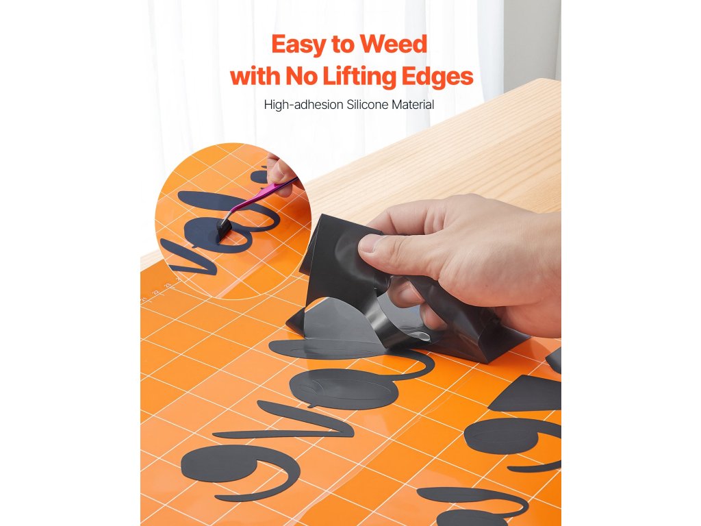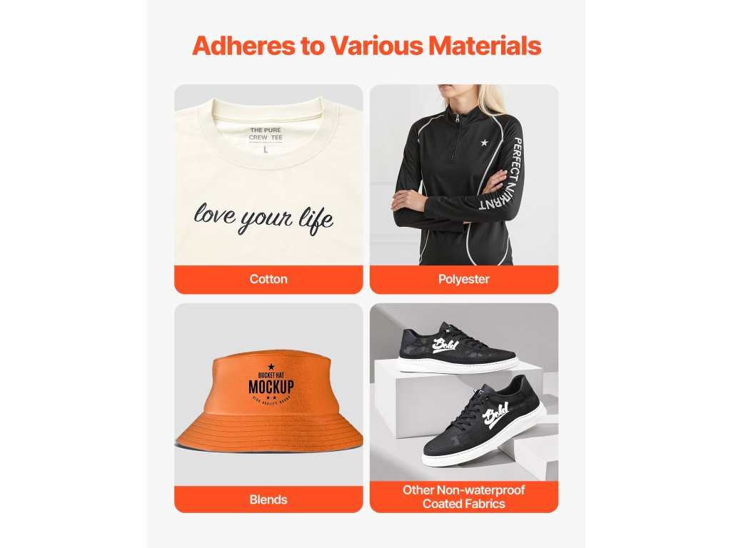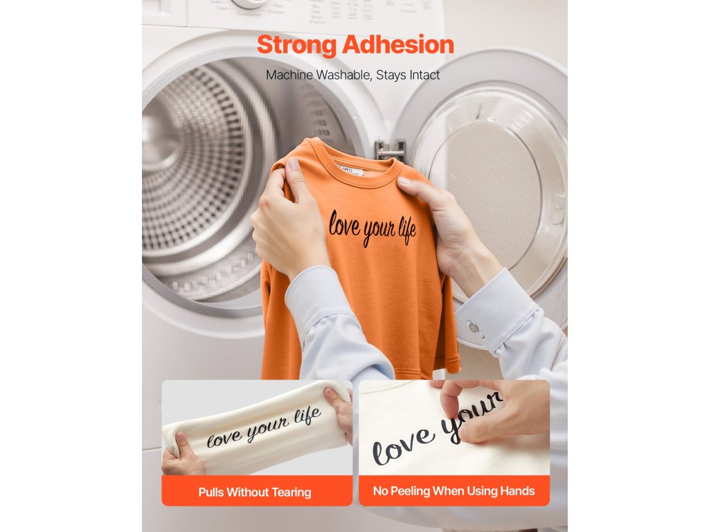 A Vinyl HTV ragasztó PET-hátlapot tartalmaz, amely a ruhadarabokhoz tapad, és lehetővé teszi azok elhelyezését. Nyomás előtt kézzel beállíthatja, hogy pontos elhelyezést biztosítson a minta elmozdulása nélkül - nincs szükség találgatásra.