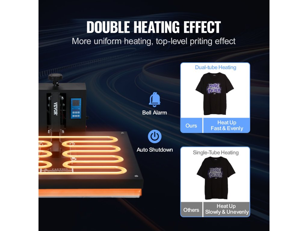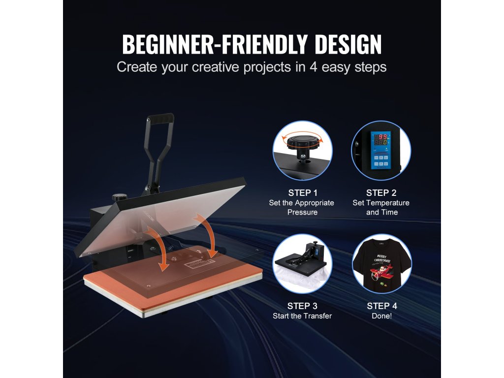 A nagy, 16 x 24 hüvelykes munkafelület elegendő helyet biztosít az egyszerűbb hősajtolási eljárásokhoz. Ezenkívül a megerősített lemez fokozza a jobb hőtartást, biztosítva a jó hőállóságot, így biztos lehet benne, hogy szép átviteli mintázatot kap.