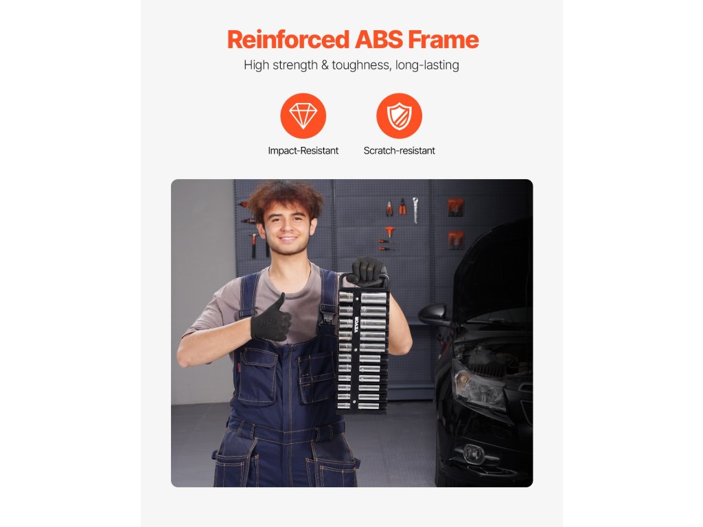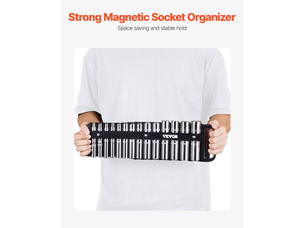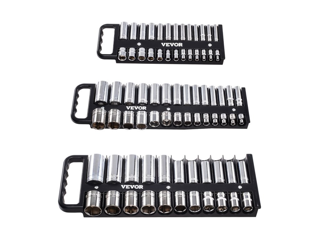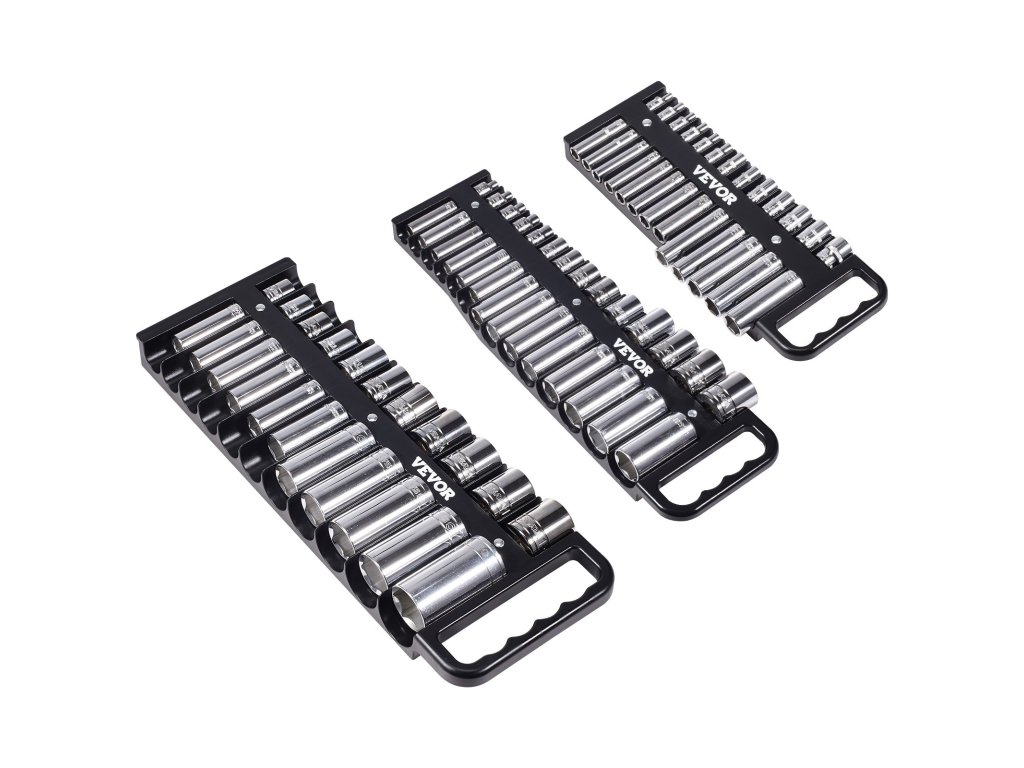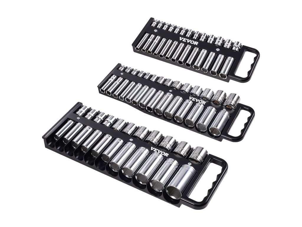 Ez a hordozható szervező készlet 76 1/4''', 3/8''' és 1/2'' aljzatot tartalmaz metrikus és SAE méretben, állítható távolságtartással, hogy minden rendezetten és könnyen kezelhető legyen.