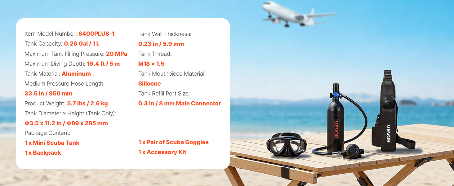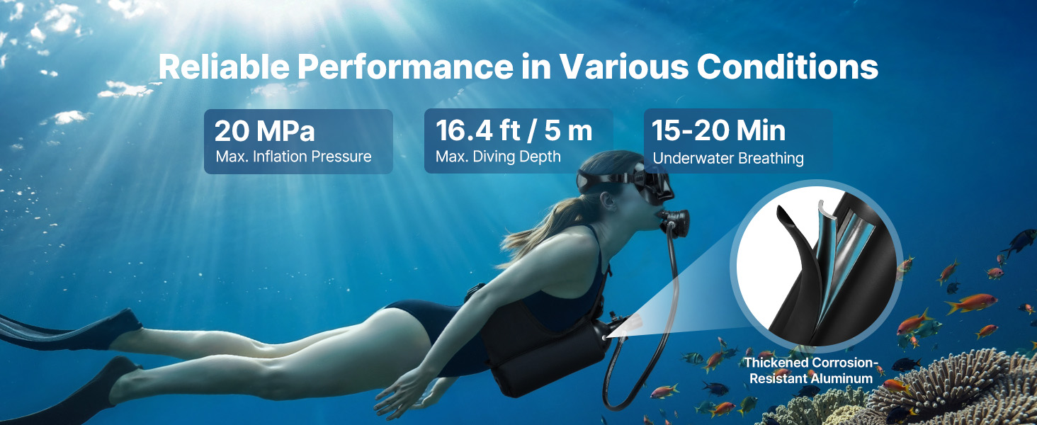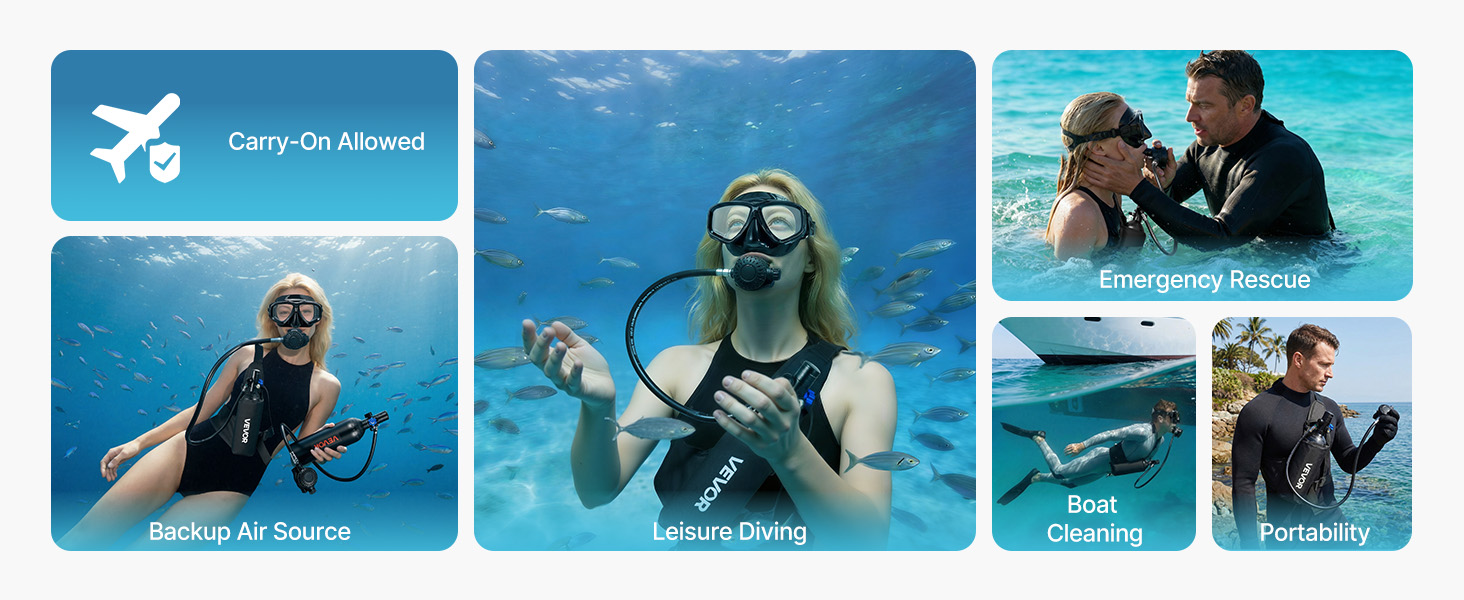A hordozható búvárpalack elfér egy hátizsákban, így könnyen szállítható. Üres állapotban repülőgépen is szállítható, így ideális strandoláshoz, sznorkelezéshez és tengerparti felfedezésekhez.