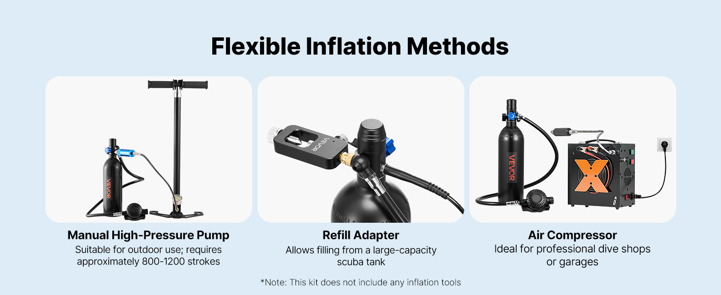 A búvárpalack-készletünk különböző újratöltési lehetőségeket támogat: kézi pumpa, búvárpalack-adapter vagy kompatibilis légkompresszor. Megjegyzés: Az utántöltő eszközöket nem tartalmazza. Használat előtt győződjön meg róla, hogy rendelkezik kompatibilis utántöltő eszközzel.