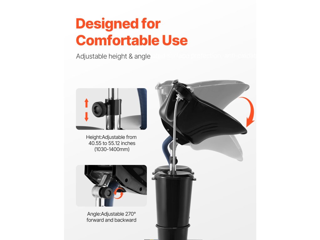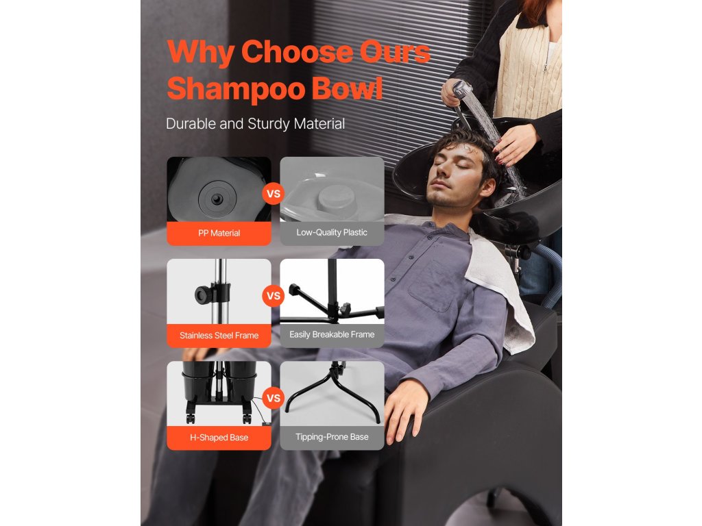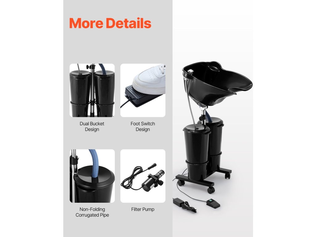 A hordozható szalonmosogató lábpedálos kapcsolóval van felszerelve a vízszivattyú vezérlésére, amely lehetővé teszi a tiszta és szennyezett víz egyszerű szivattyúzását. Ez javítja az ellenőrzést és kiküszöböli a kézi lépéseket, növelve a hajmosás általános hatékonyságát.