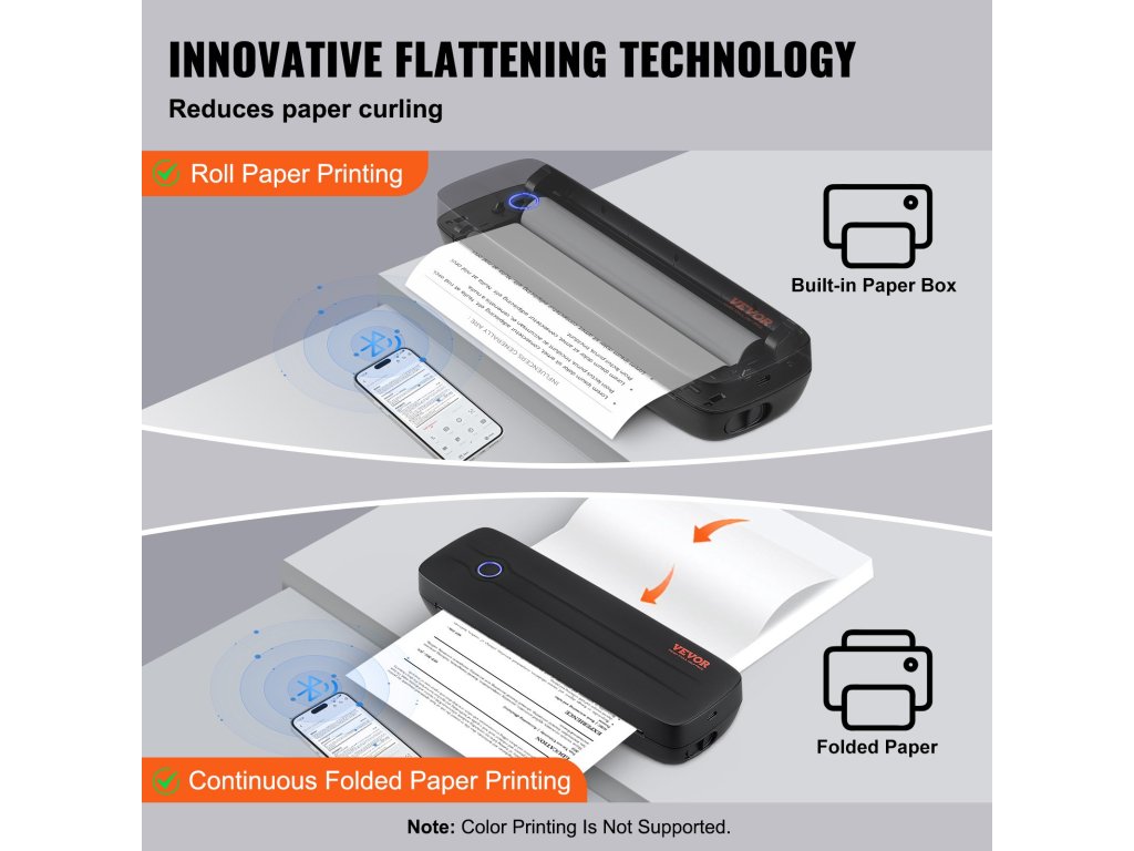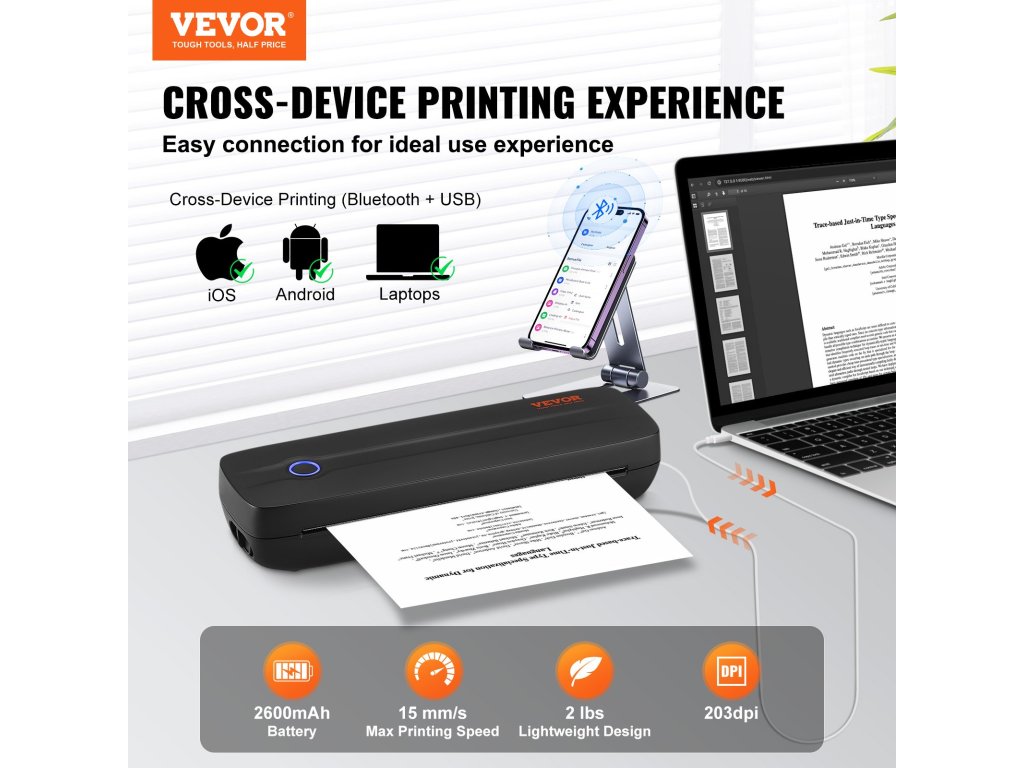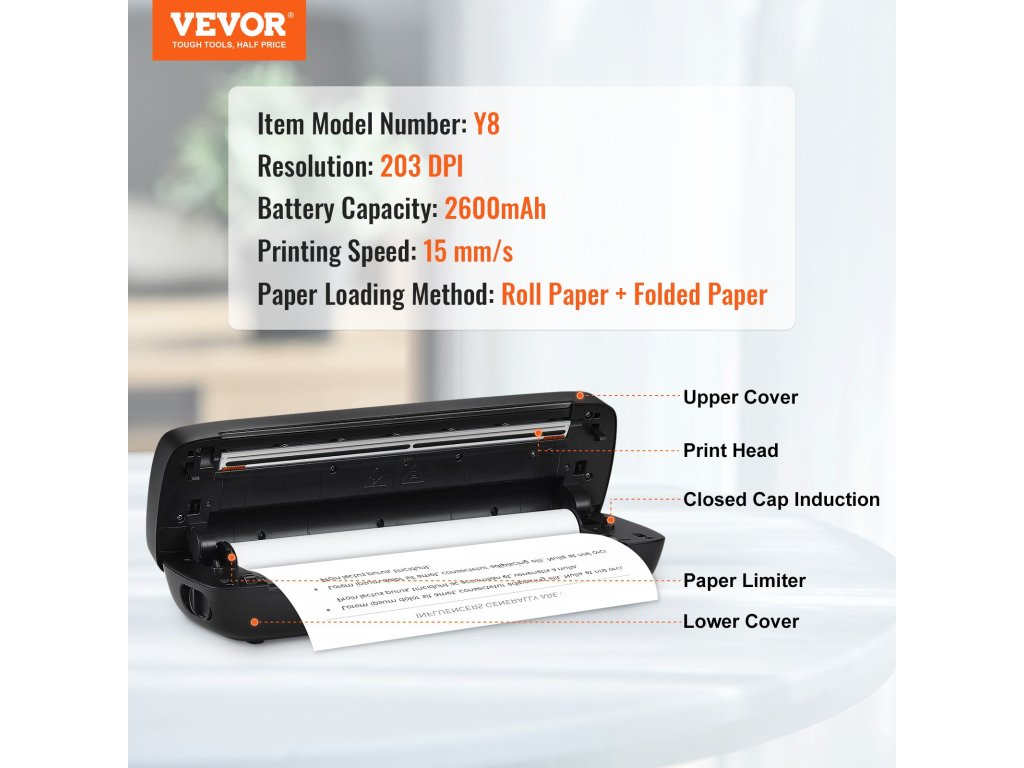 A VEVOR hordozható hőnyomtató könnyű és hatékony nyomtatást kínál 2600 mAh-s akkumulátorral. Több rendszerhez is csatlakoztatható, és 2 és 8,5 hüvelyk közötti papírméreteket támogat, így kiváló minőségű, tintamentes nyomtatásokat biztosít útközben is.