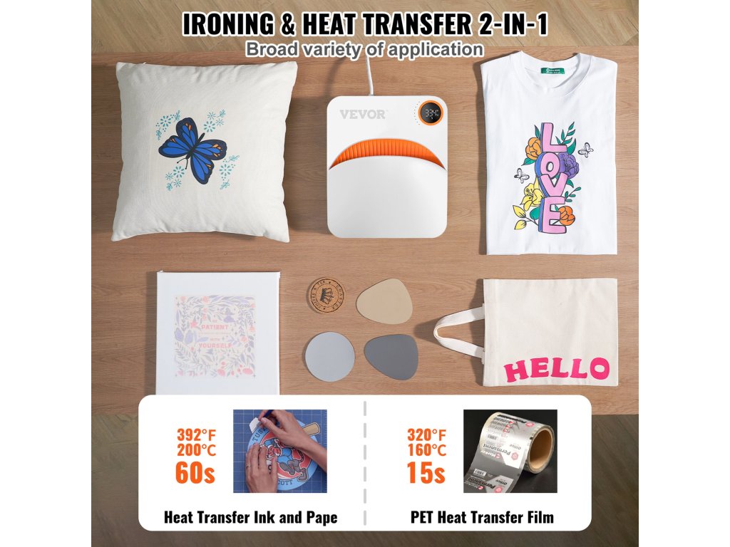 A VEVOR házi hősugárzó itt van, hogy hozza a meleget! Vasalóként és hőtranszferprésként is funkcionálhat, amely gyorsabban és egyenletesebben melegít, mint más hagyományos vasalók, miközben megőrzi kiváló praktikusságát. Egyszerűen csak nyomja meg és fedezze fel kreatív útját.