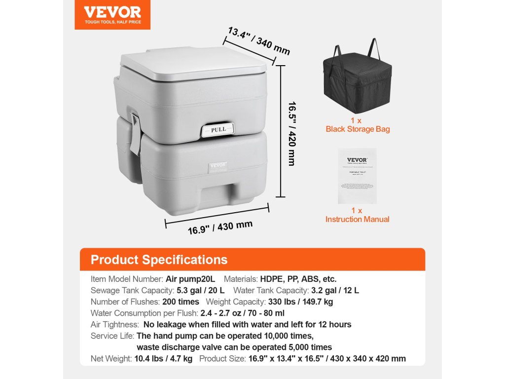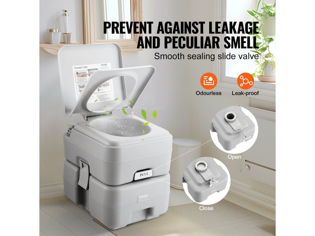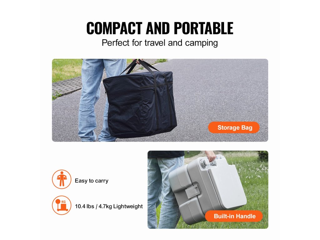 A hordozható WC nagy, 5,3 gal/20 literes hulladéktartály kapacitással rendelkezik, öblítő funkcióval, ideális hosszú távú utazásokhoz, alkalmas lakókocsikban, hajókon, teherautókon, vidéki kempingezéskor, útközben stb. történő használatra.