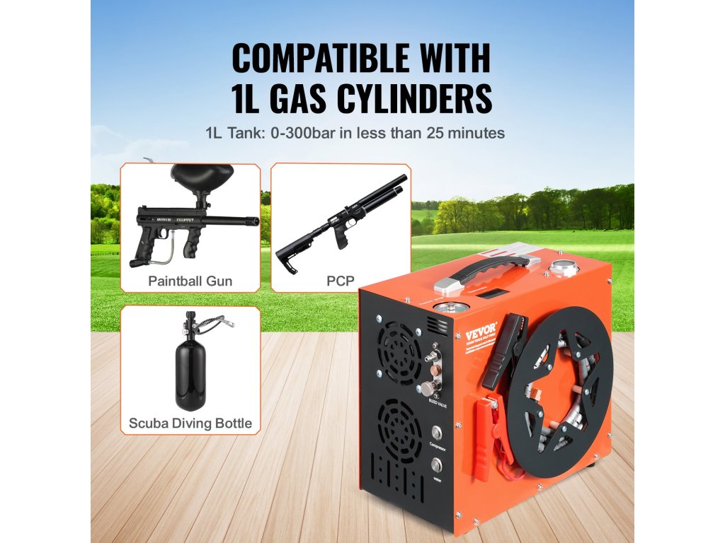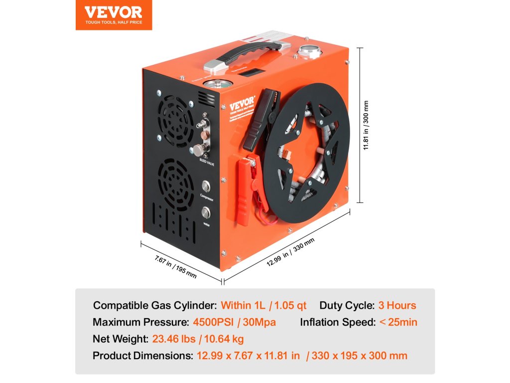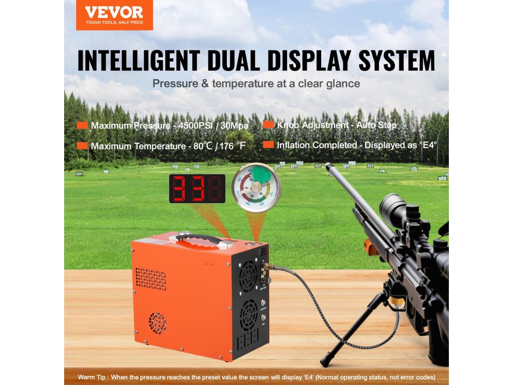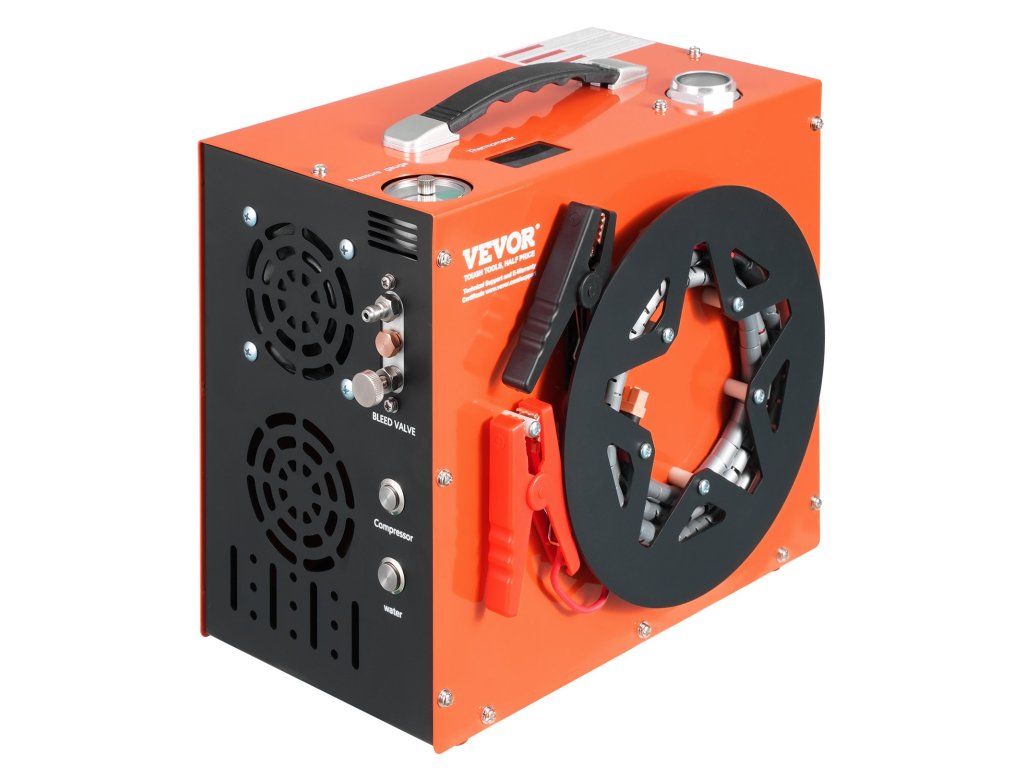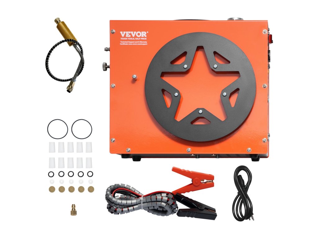 VEVOR PCP légkompresszor: korlátlan levegőellátás, bármikor, bárhol! Beépített 600W-os inverterével lehetőséget biztosít a DC12V és AC230V kettős töltésre. Élvezze a gyors felfújást a VEVOR kompresszorral: 4500 PSI maximális nyomás, beépített víz- és ventilátoros hűtőrendszer, valós idejű nyomáskijelzés és automatikus leállítás.
