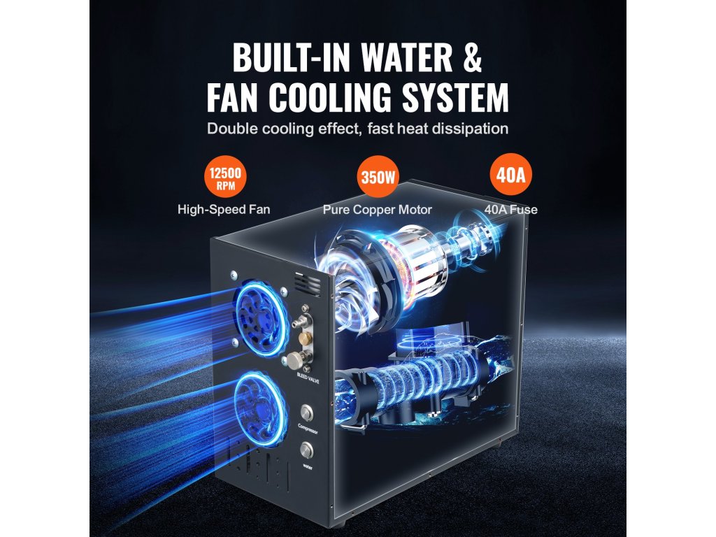 Ez a búvárlégkompresszor továbbfejlesztett hűtőrendszert használ, amely megkíméli Önt a karbantartással és tisztítással járó gondoktól. Nagy sebességű, 12 500 fordulat/perc fordulatszámú ventilátorral és 40A biztosítékkal felszerelve erőteljes teljesítményt nyújt, és nagy terhelést is elbír.