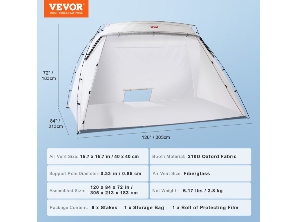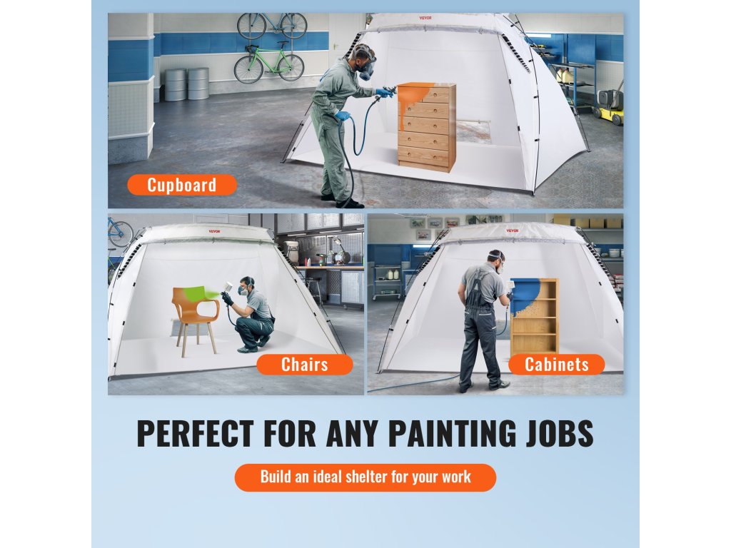 Nafukovacia maliarska kabína VEVOR je všestrannou a prispôsobivou možnosťou pre vaše rôzne maliarske projekty, pretože poskytuje dokonalú kombináciu prenosnosti, všestrannosti, priestorovo úsporného dizajnu a efektívnosti. Tento prístrešok na maľovanie pre domácich majstrov sa dá ľahko prepravovať a všade nastaviť, takže je ideálny na viaceré projekty, ako sú malé úlohy pre domácich majstrov, obracanie nábytku a veľké priemyselné aplikácie. Môžete ju dokonale používať, či už ste začiatočník alebo nováčik.