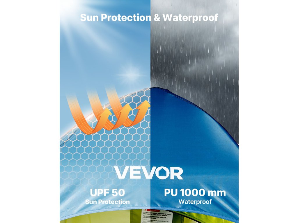 Kemping zuhanysátrunk UPF 50 napvédő anyagból és PU2000mm vízálló anyagból készült, amely véd a naptól és az esőtől a strandon vagy kempingezéskor, és szárazon és kényelmesen tartja a belső teret.
