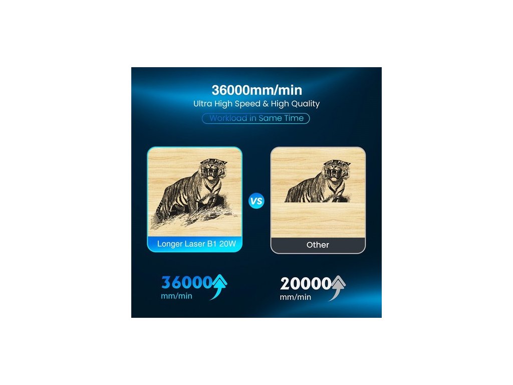 A B1 lézer új 32 bites alaplappal van felszerelve, amely akár 36 000 mm/perc gravírozási sebességet is lehetővé tesz, ami négyszer gyorsabb, mint a hagyományos lézergravírozó gépeknél. Ezenkívül a TMC2209 csendes meghajtókat használnak, amelyek hatékonyan csökkentik a működési zajt, és gyorsabb és kellemesebb élményt nyújtanak.