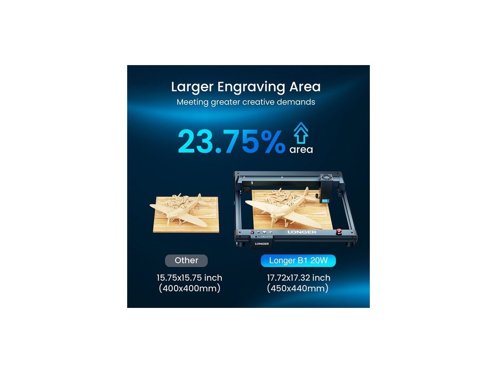 A 17,72×17,32 hüvelyk/450×440 mm-es munkaterülettel a 20 W-os B1 lézer 23,75%-kal nagyobb munkaméretet biztosít a többi lézerhez képest, így a legtöbb forgatókönyv követelményeinek megfelel, különösen ideális A3-as táblákhoz.