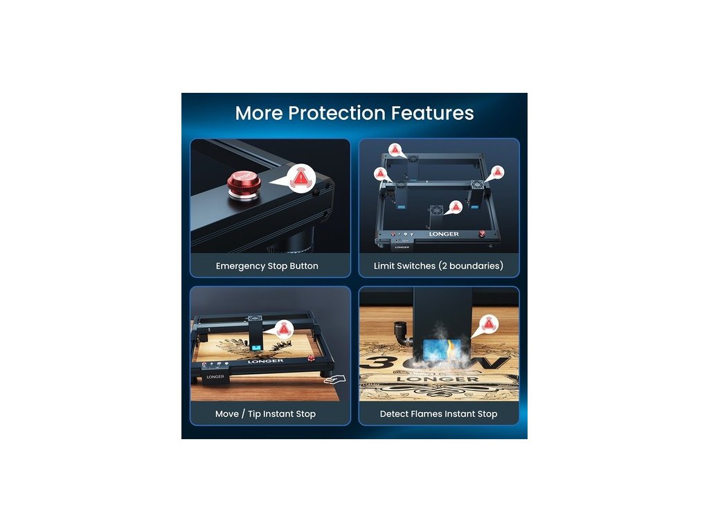 Nyolc biztonsági védelmi funkció van telepítve, pl. mozgás/láng be/ki/mozgás nélkül/biztonsági zár/szemvédelem/ vészleállító gomb/nulla visszaállítás. A lézer automatikusan kikapcsol, ha 15 másodpercnél hosszabb esést, lángot, adatmegszakítást és a lézerfej befagyását észleli. Ezenkívül a lézerfej automatikusan visszaáll, hogy tűz esetén megakadályozza a kiégést. A panoráma szűrőüveg pedig hatékonyan kiszűri a lézer 99,8%-át, így biztonságosabbá teszi a használatát.
