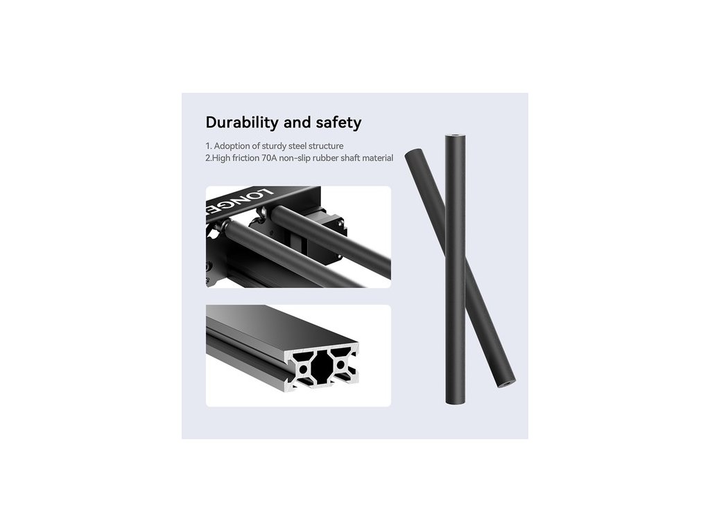 A lézeres forgóhengerünk tartósan készült, masszív acélszerkezetével biztosítja a tartósságot és a hosszú élettartamot. A nagy súrlódású 70A csúszásmentes gumialap további stabilitást és irányíthatóságot biztosít. A mindkét oldalon található beosztások és a hornyok kialakítása segíti a párhuzamos gravírozást, míg a más gravírozógépekkel való széles körű kompatibilitás lehetővé teszi, hogy más márkájú gépekkel is könnyedén dolgozhasson.