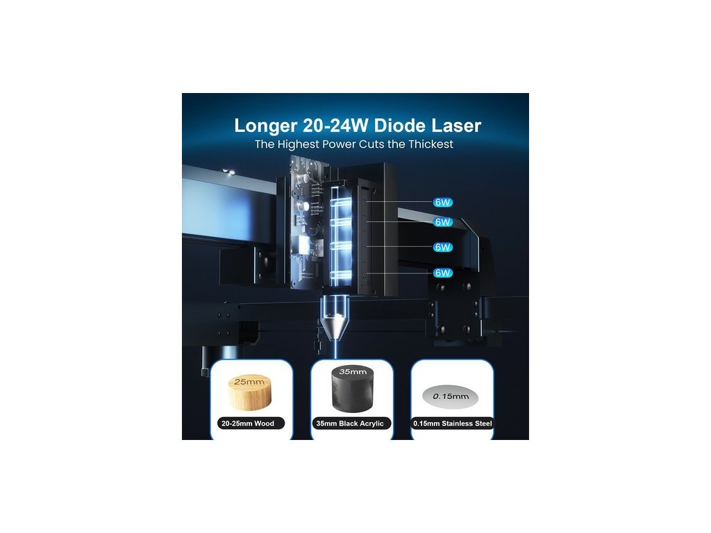 A B1 20W-os lézer a legmodernebb hatmagos lézertechnológiát alkalmazva 20-24W-os optikai kimeneti teljesítménnyel rendelkezik, ami az egyik legerősebb ma kapható diódalézer, és ezáltal sokkal erősebb vágási képességgel rendelkezik. A B1 20W-os lézer egy menetben 15 mm fenyőfát, 8 mm fekete akrilt és még 0,1 mm rozsdamentes acélt is képes átvágni, 20 mm hársfát és 35 mm fekete akrilt pedig több menetben.