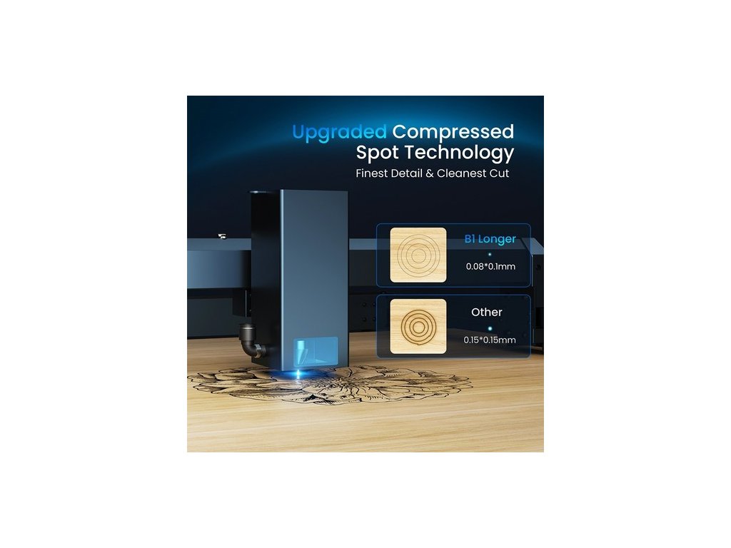 A legmodernebb lézercsatolási technológiának köszönhetően a 20 W-os B1 lézer vékonyabb és hosszabb fókusztávolsággal (50 mm), de erősebb lézersugárral rendelkezik, ami több mint 20%-kal növeli a vágási képességet más 20 W-os lézerekhez képest. Több átmenettel 20 mm-es hársfát és 35 mm-es fekete akrilt is képes átvágni.