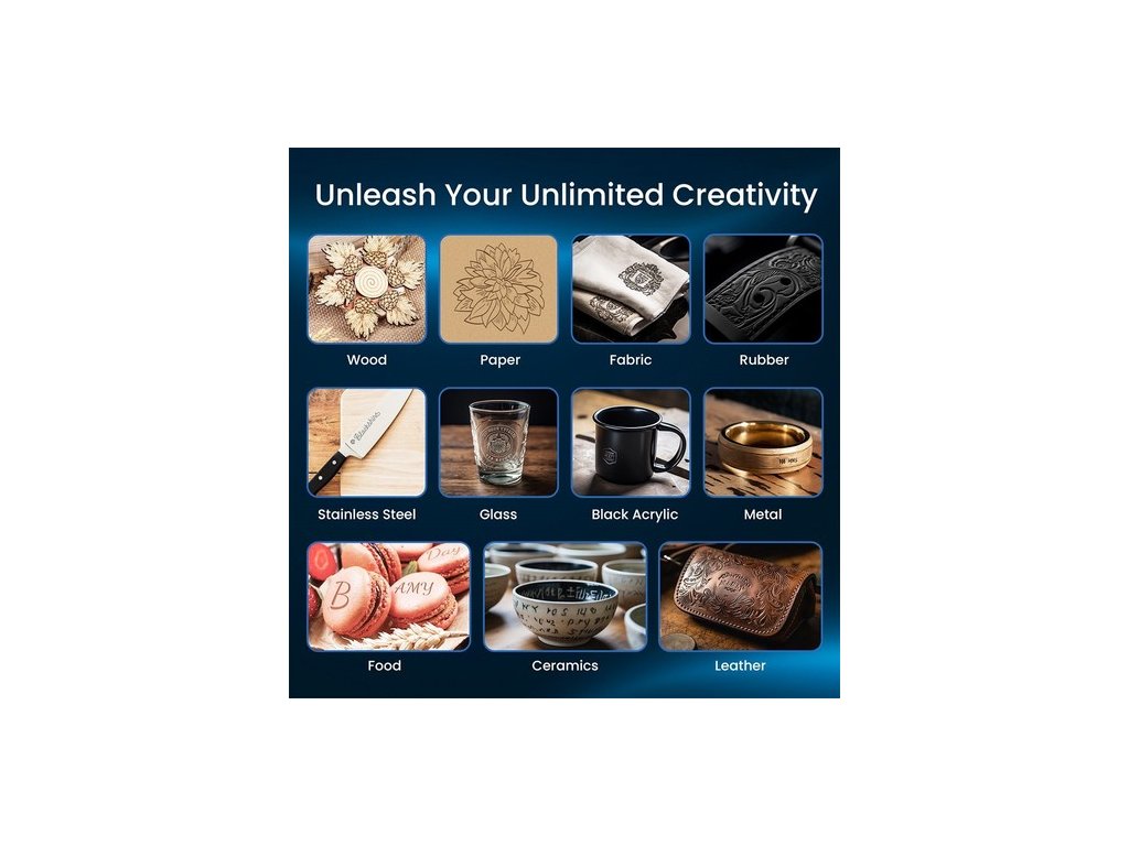 A 20-24 W-os lézerteljesítménnyel és erőteljes vágási és gravírozási képességeivel a B1 lézer több mint 1000 anyagot képes vágni vagy gravírozni, például fát, rozsdamentes acélt, bőrt, ezüstöt, akrilt, szövetet és még sok mást.