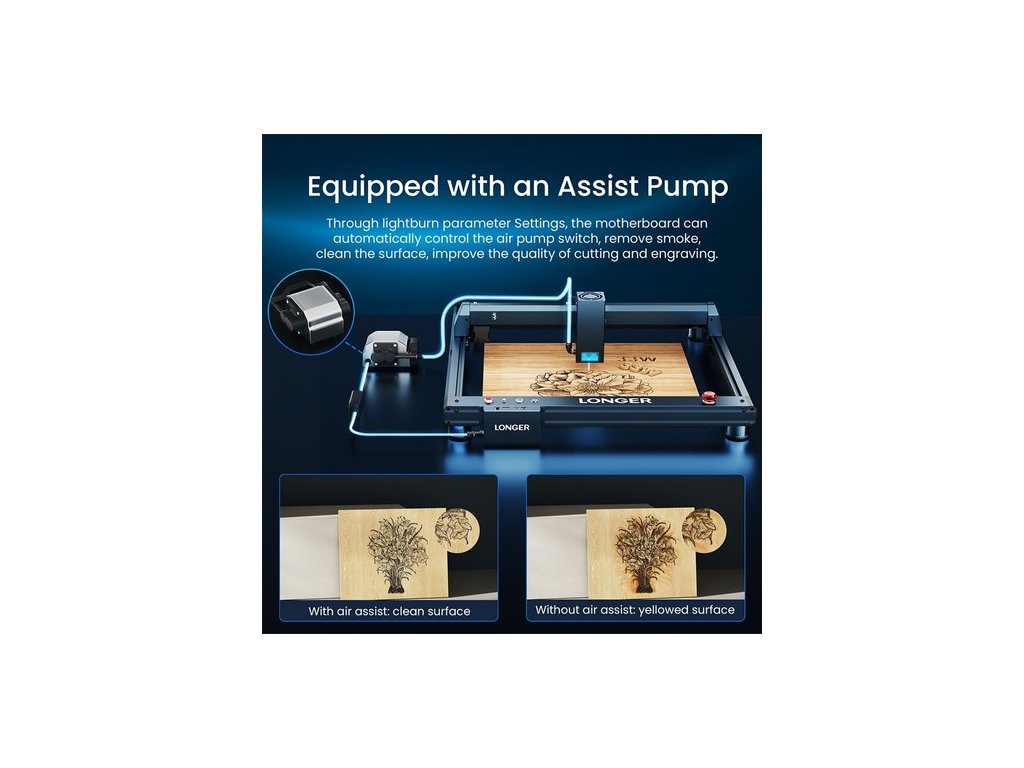 Az Airassist szivattyú automatikusan be- és kikapcsolható. Ezt a programban beállított paraméterek alapján közvetlenül a fáklya fénye vezérli, ami nagymértékben növeli a vágási képességet, valamint nagymértékben javítja a vágási pontosságot és minőséget.