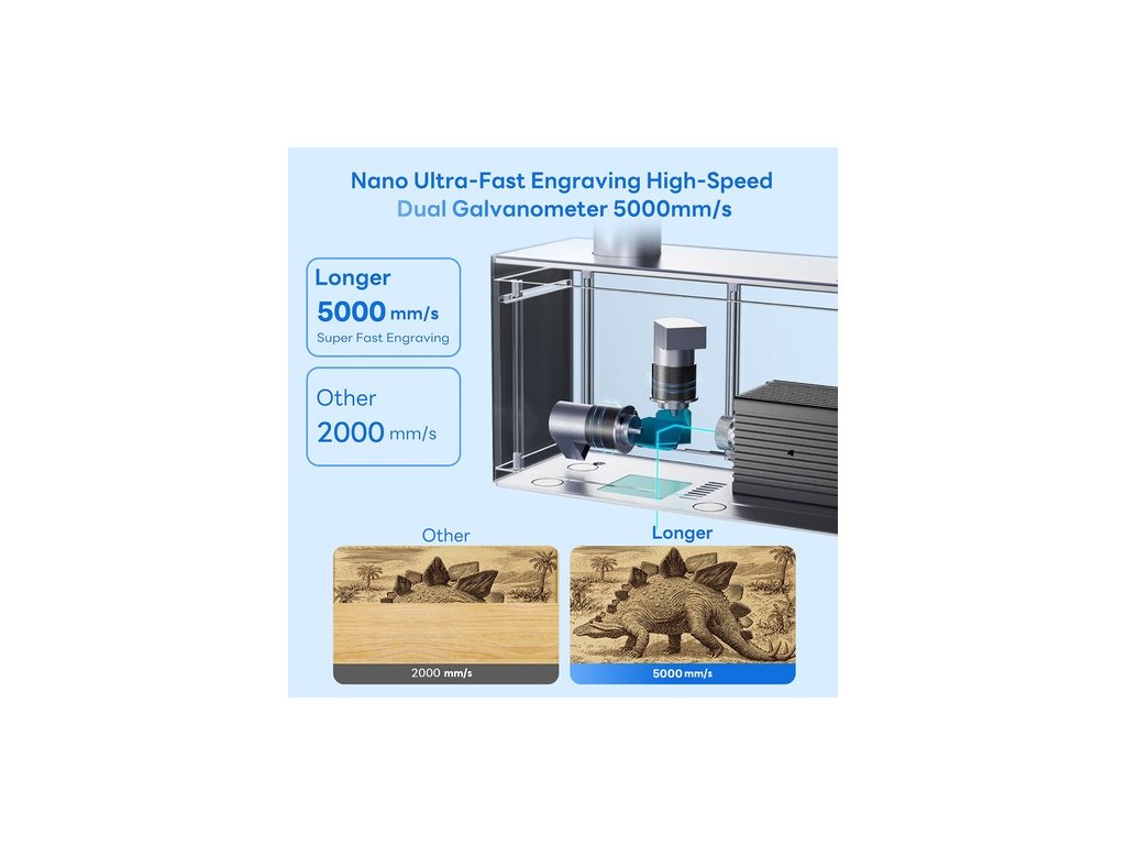 A Nano fejlett kettős fókuszú lencse technológiával rendelkezik, amely rendkívül részletes gravírozást biztosít akár 3,3K felbontással és 0,05 mm-es pontossággal. A legmodernebb nagy sebességű galvanometriai technológiával felszerelt készülék akár 32 000 mm/s előnézeti sebességet és 5000 mm/s gravírozási sebességet kínál.