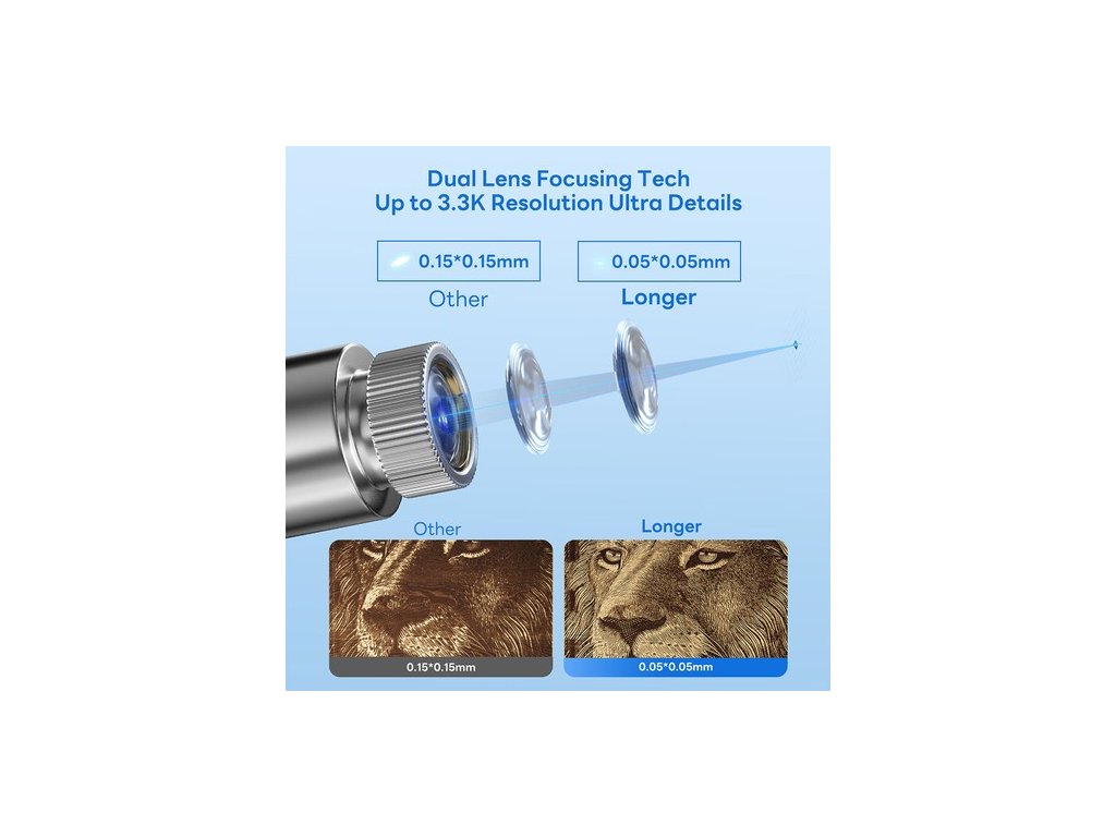 A hosszabb Nano lézer kompakt méretével, nagy hatékonyságával és gyors gravírozási képességeivel tűnik ki, így kategóriájában a leggyorsabb készülék. Figyelemre méltó, 0,02 milliméteres mezőlencse-pontosságával minden alkalommal pontos és részletes gravírozást garantál. Számos fájlformátumot és operációs rendszert támogat, és kompatibilis az olyan népszerű gravírozó szoftverekkel, mint a LightBurn, a LaserGrbl és a LongerBurn - a Longer által kifejlesztett saját szoftver. Ez a csúcstechnológiájú szoftverekkel való zökkenőmentes integráció javítja az általános felhasználói élményt, és zökkenőmentes kapcsolatot teremt a hardver és a szoftver között.