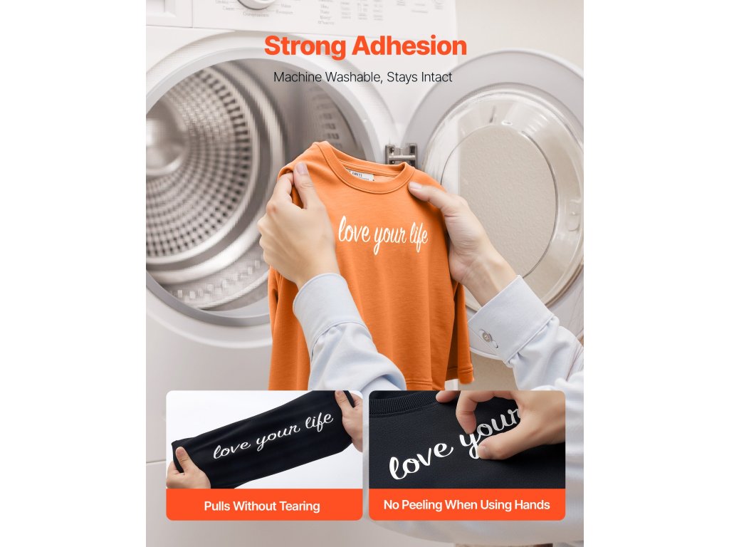 A Vinyl HTV ragasztó PET-hátlapot tartalmaz, amely a ruhadarabokhoz tapad, és lehetővé teszi azok elhelyezését. Nyomás előtt kézzel beállíthatja, hogy pontos elhelyezést biztosítson a minta elmozdulása nélkül - nincs szükség találgatásra.
