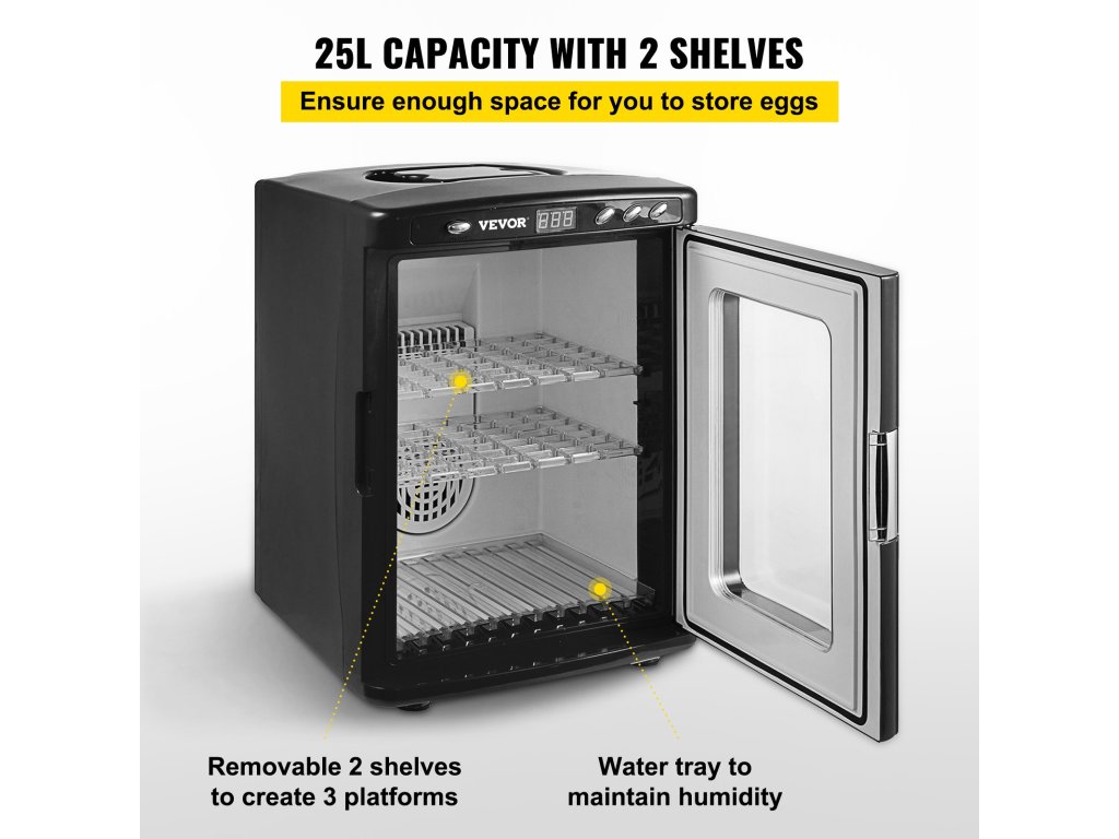 A tudományos laboratóriumi inkubátor kapacitása 25 liter. Két kivehető polcot tartalmaz a kényelmes tárolás érdekében, valamint egy víztartályt a páratartalom fenntartásához.