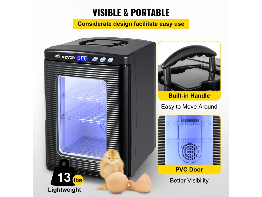 A tojáskeltető a jobb megfigyelhetőség érdekében látható PVC ajtóval van kialakítva. Ezenkívül a beépített fogantyúnak és a 13 kg-os súlynak köszönhetően hordozható.