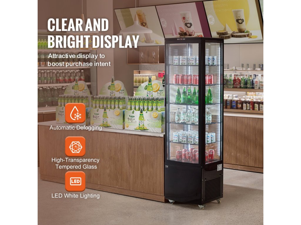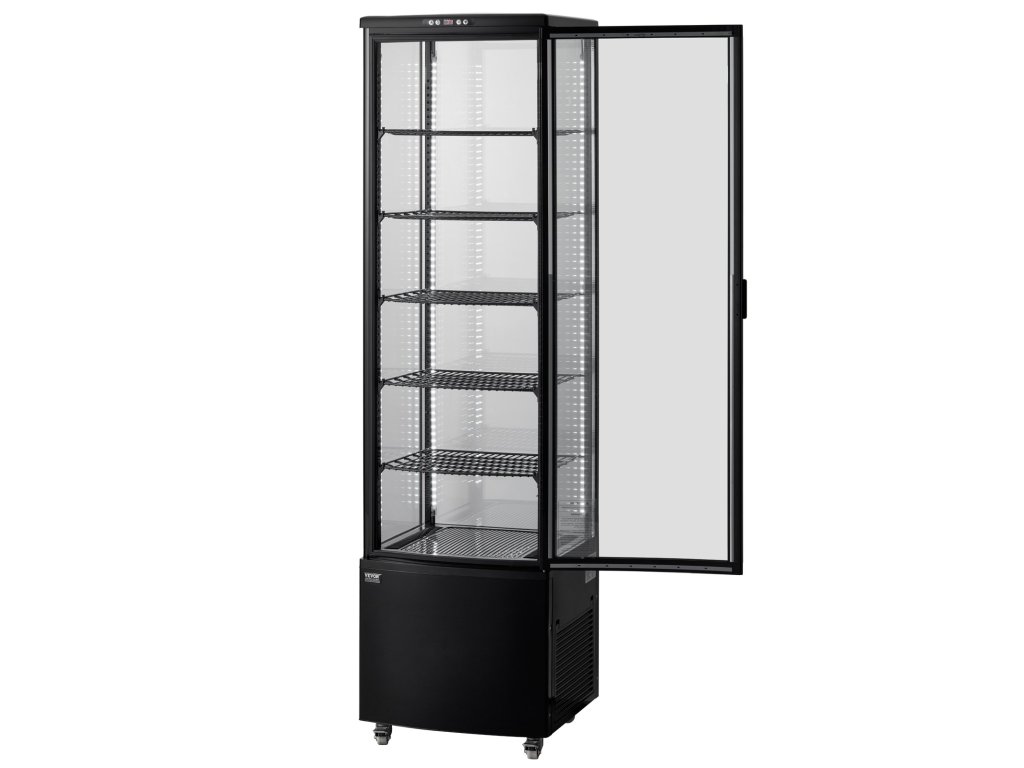 az 5 állítható polc lehetővé teszi a különböző magasságú tárgyak rugalmas elhelyezését. Négy LED-es lámpa és a nagy átlátszóságú edzett üveg fokozza az ételek vonzerejét, növelve a vásárlók általi vásárlás valószínűségét.
