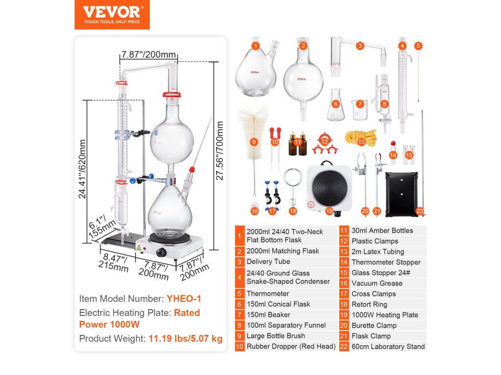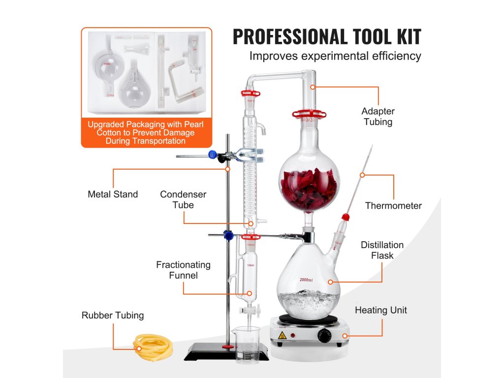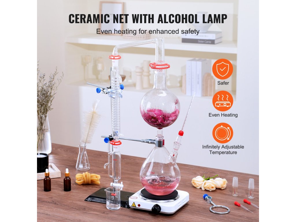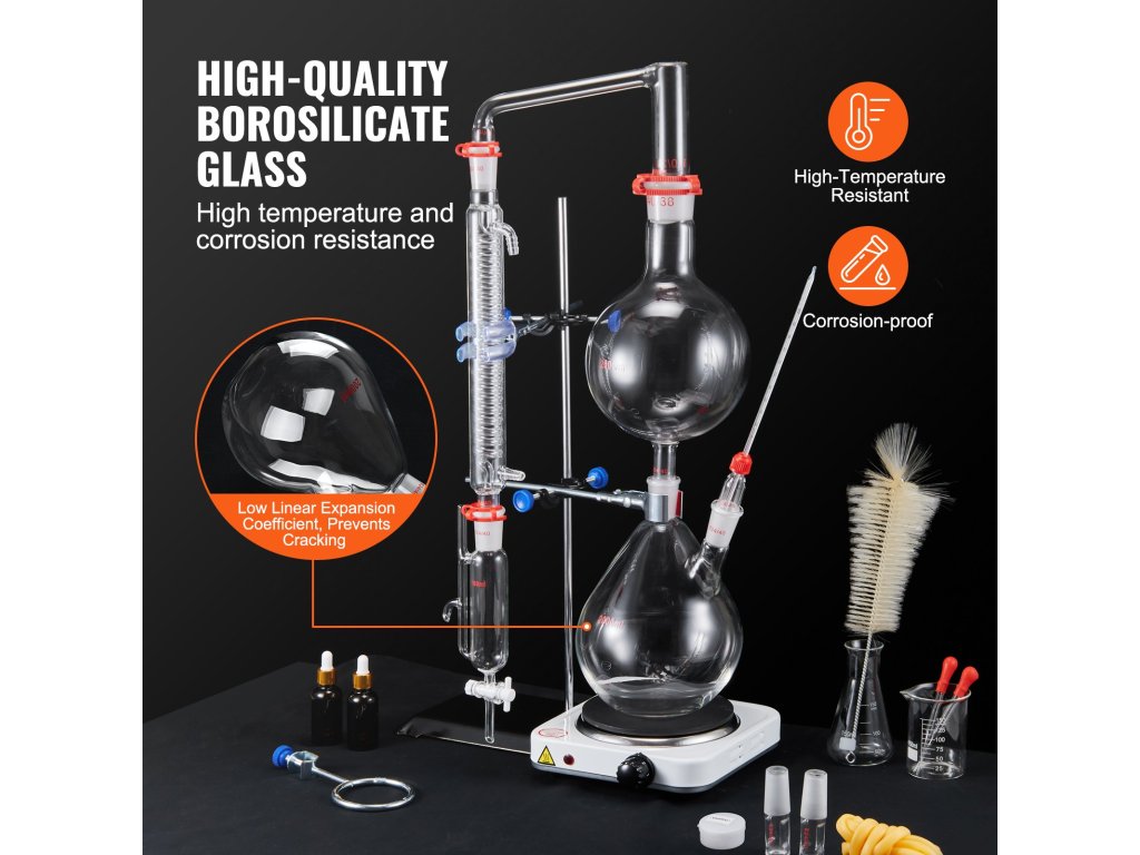 Növelje az illóolajok extrakciós szintjét a VEVOR desztilláló készülékkel. Tartós boroszilikát üvegből készült 3.3 és garantálja a hosszú élettartamot és megbízhatóságot. Magas hőmérséklet- és korrózióállósággal is rendelkezik, így garantálja a hatékony kísérleteket és a magabiztos eredményeket!
