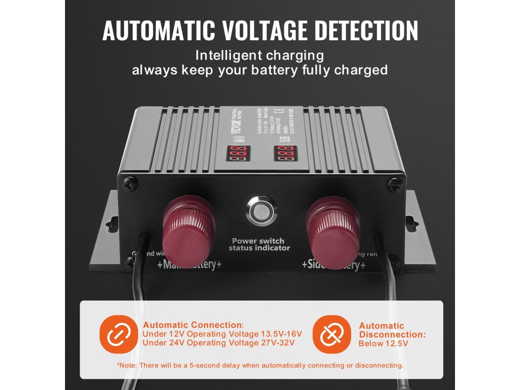 Intelligens akkumulátor leválasztónk automatikusan csatlakozik, ha a feszültségtartomány 13,5V-16V 12V-os üzemi feszültségen és 27V-32V 24V-os üzemi feszültségen. És amikor a feszültség < 12,5 V, az áram automatikusan megszakad. A vészhelyzeti gomb megnyomásával azonnal használhatja a másodlagos akkumulátort.