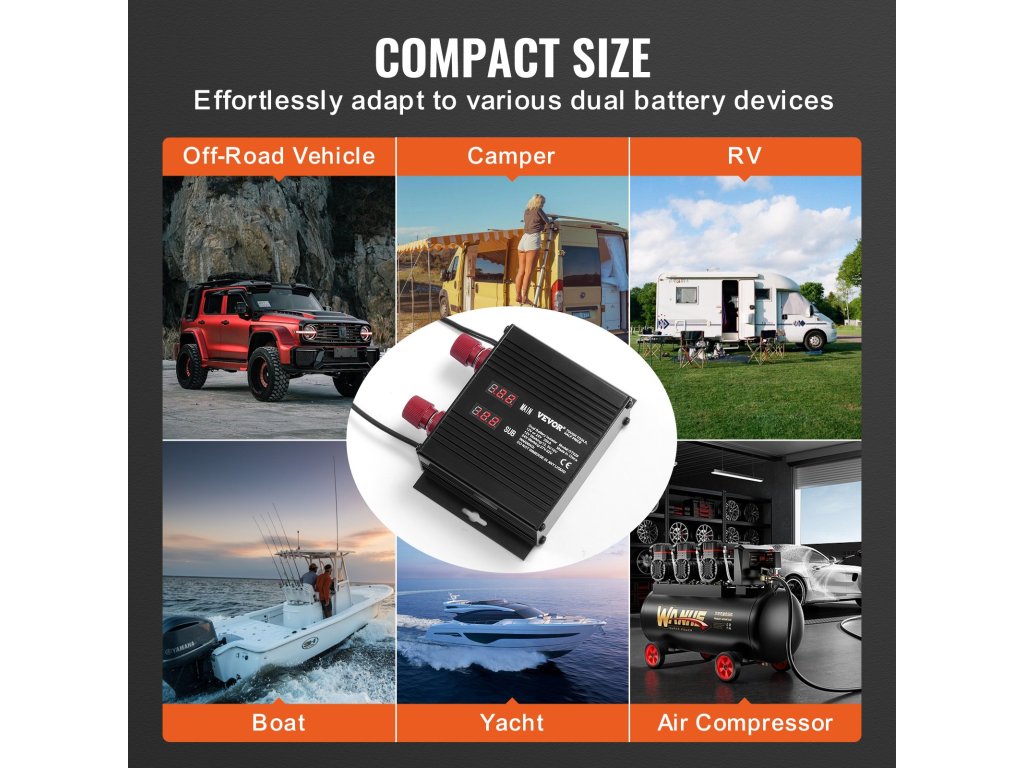 A 250A kompakt feszültségérzékeny relés leválasztó kapcsolónk mindössze 5,9'' x 5,4'' x 1,8'' méretű, így bármilyen helyre könnyen telepíthető. Tökéletes a motorháztető alá vagy egy terepjáró jármű belsejébe történő felszereléshez, és hibátlanul működik a két akkumulátoros rendszerrel.