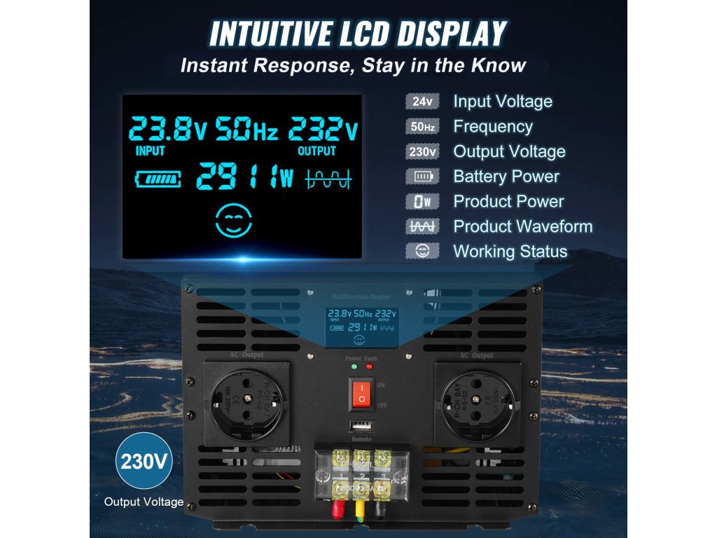 Inverter 24V→230V 3000 W tiszta szinusz hullám USB, LCD és EU csatlakozókkal