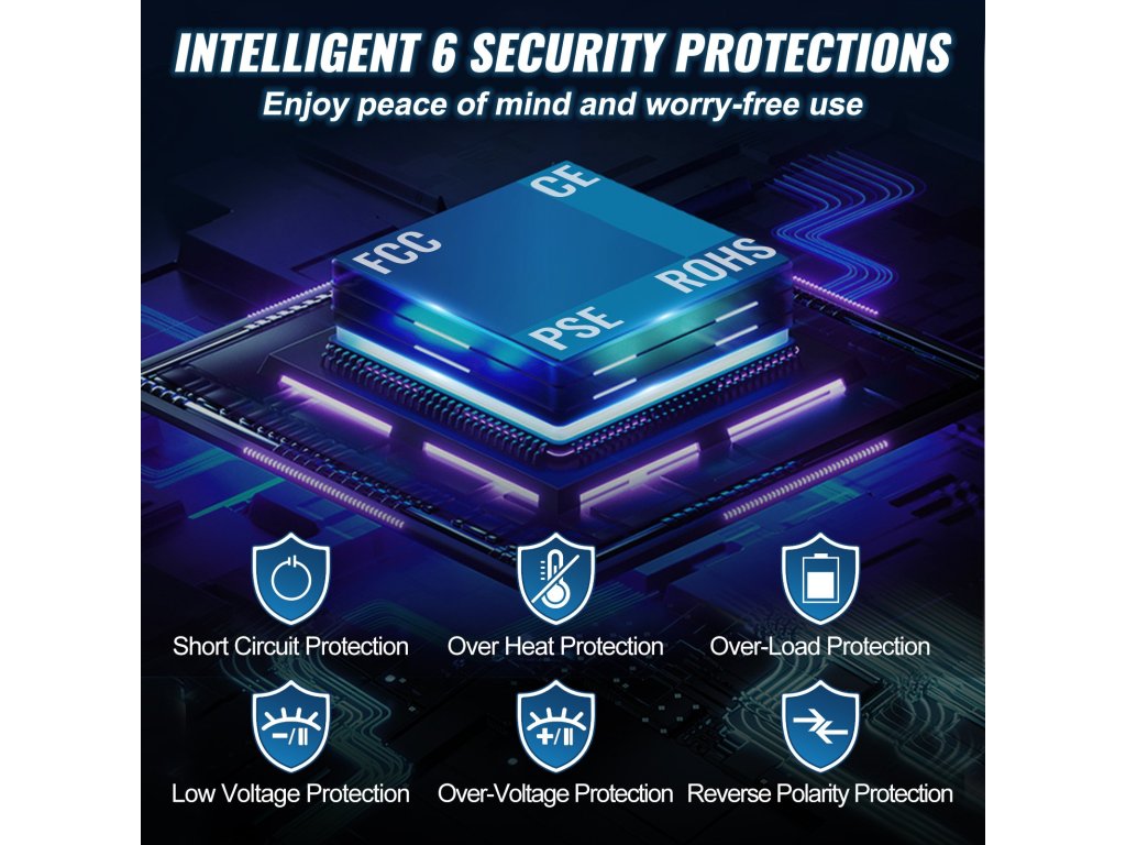 A tiszta szinuszhullámú áramátalakító CE, FCC, RoHS és PSE tanúsítványokkal rendelkezik a biztonság és megbízhatóság érdekében. Hat fő védelmi intézkedés biztosítja az Ön és berendezései biztonságát, és segíti az elektromos készülékek stabil működését.