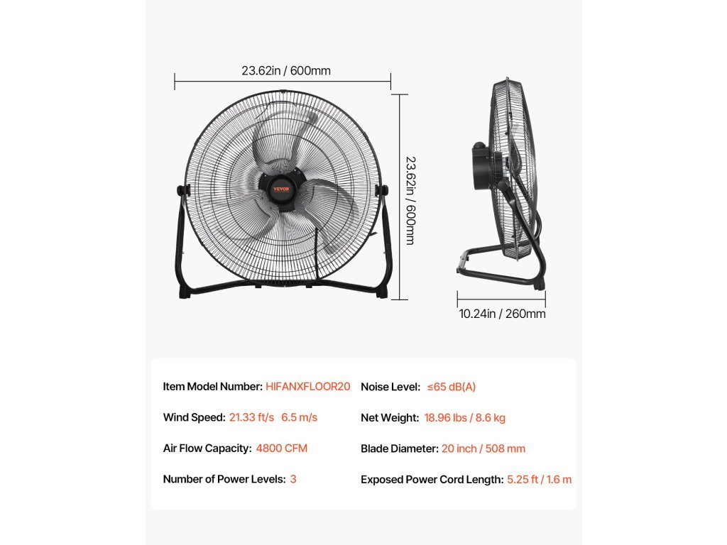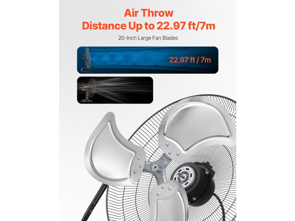 A nagy teherbírású ipari ventilátor fémrácsos, fekete porszórt bevonattal ellátott, rozsdaálló és tartós kivitelű. A nagyméretű, 20 hüvelykes alumínium lapátok erősek, hajlításállóak és tartósnak készültek. A kiváló minőségű dupla golyóscsapágyas motor és a PSC hővédelem hosszú távú biztonságos és megbízható használatot biztosít.