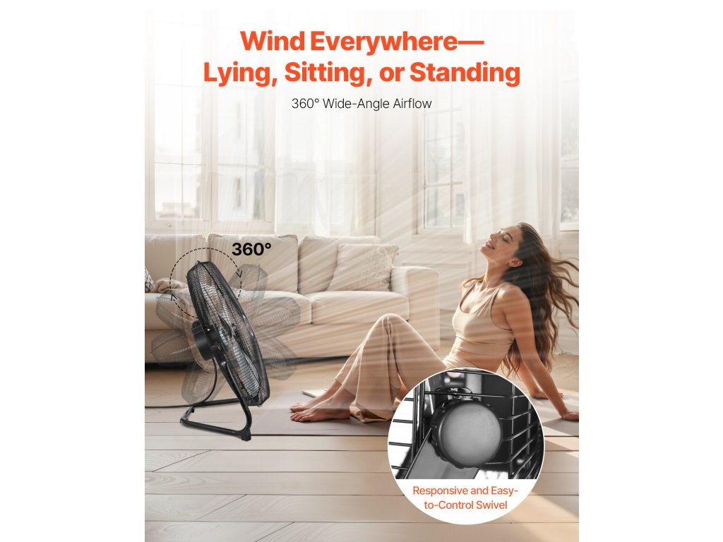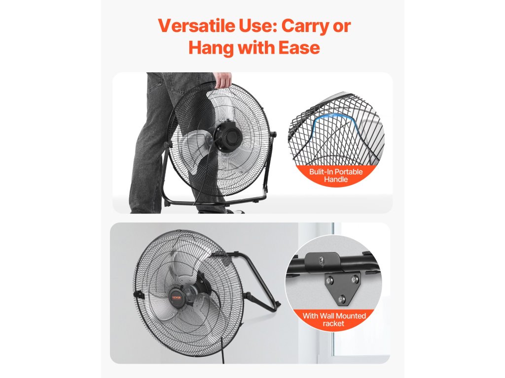 Állítható kereskedelmi ventilátorunk a könnyű felszerelés érdekében falra szerelhető konzollal és beépített fogantyúval rendelkezik. Az alap csúszásmentes gumilábai stabilitást biztosítanak, míg a forgatható mechanizmus 360°-os függőleges légáramlást biztosít. A meghosszabbított, 5,25 láb hosszú tápkábel rugalmas csatlakozási lehetőségeket kínál.